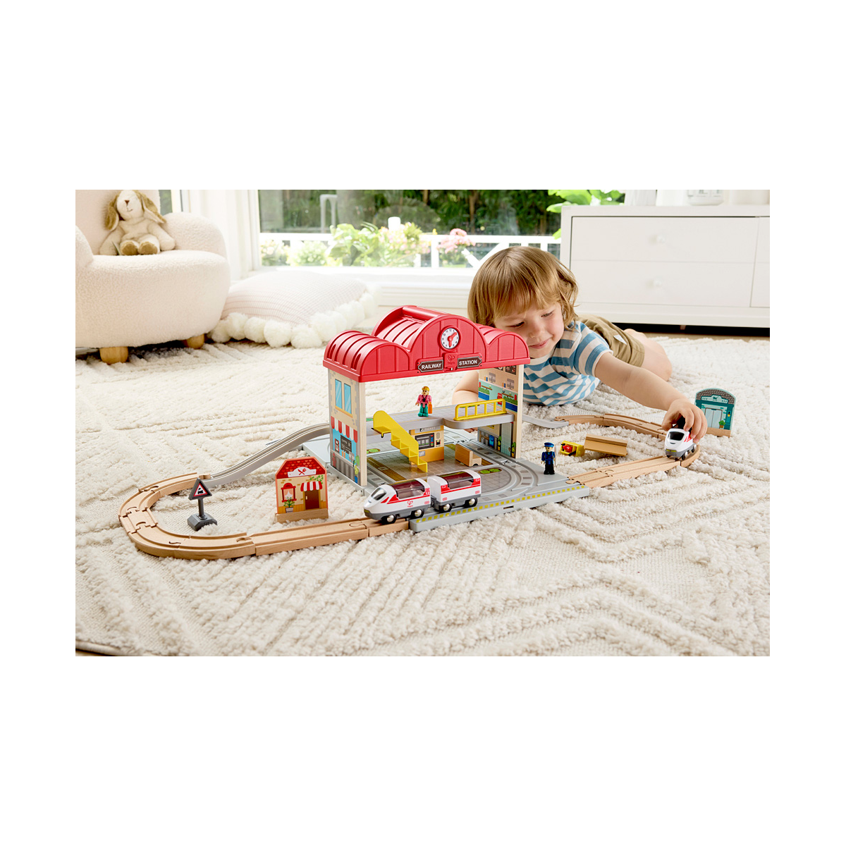 Las figuras y accesorios incluidos permiten desarrollar el juego simbólico, inventar historias y recrear situaciones de una estación de tren real. Además, al montar el circuito y mover el tren por las vías, los niños y niñas desarrollan la motricidad fina, la coordinación y la creatividad mientras juegan.