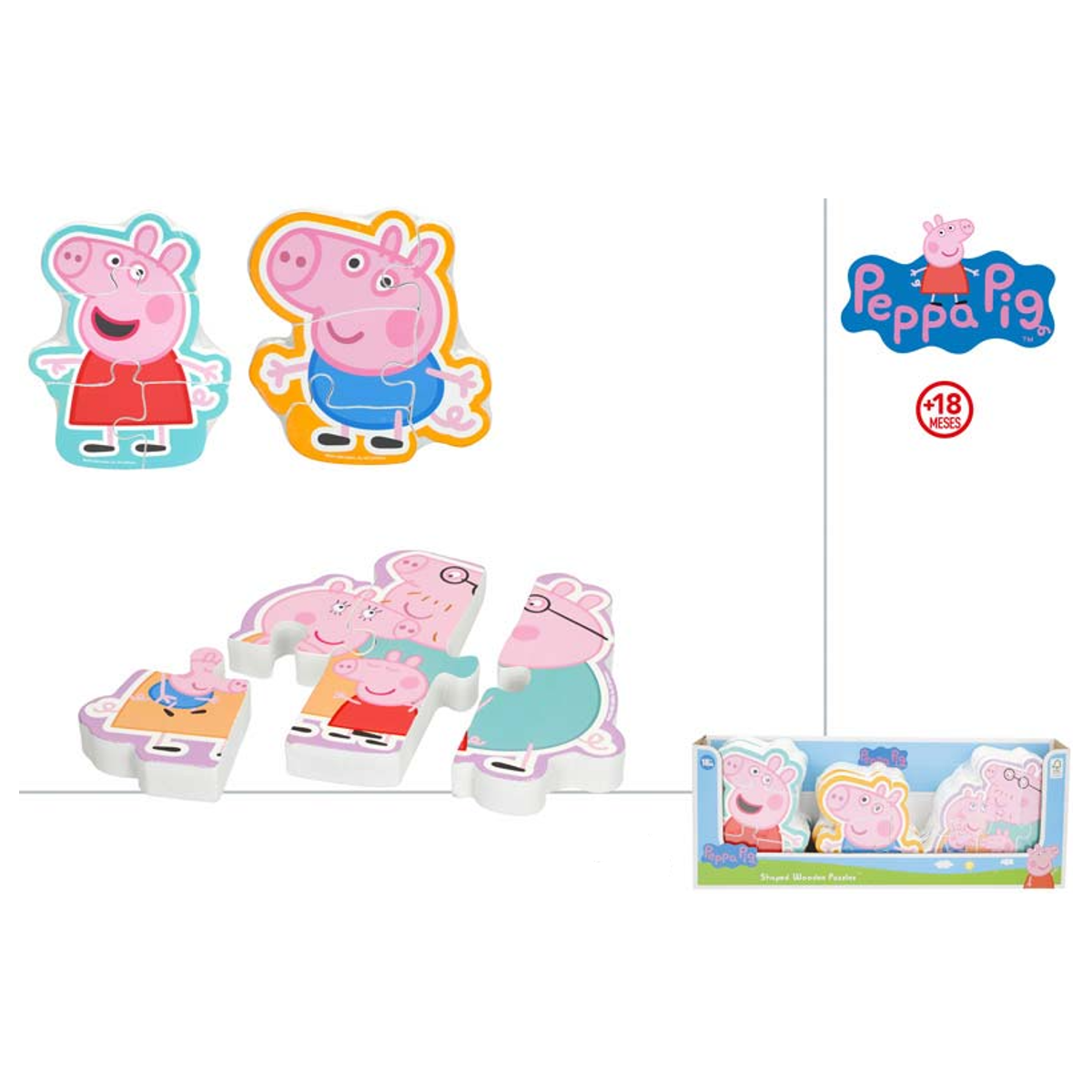 Puzzle de madera Peppa Pig con piezas grandes y resistentes, perfecto para desarrollar coordinación, motricidad y aprendizaje en niños desde 18 meses.