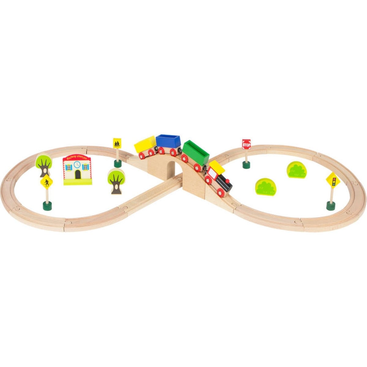 Tren de madera natural compuesto por 30 piezas y fabricado por Woomax para niños y niñas a partir de los 3 años