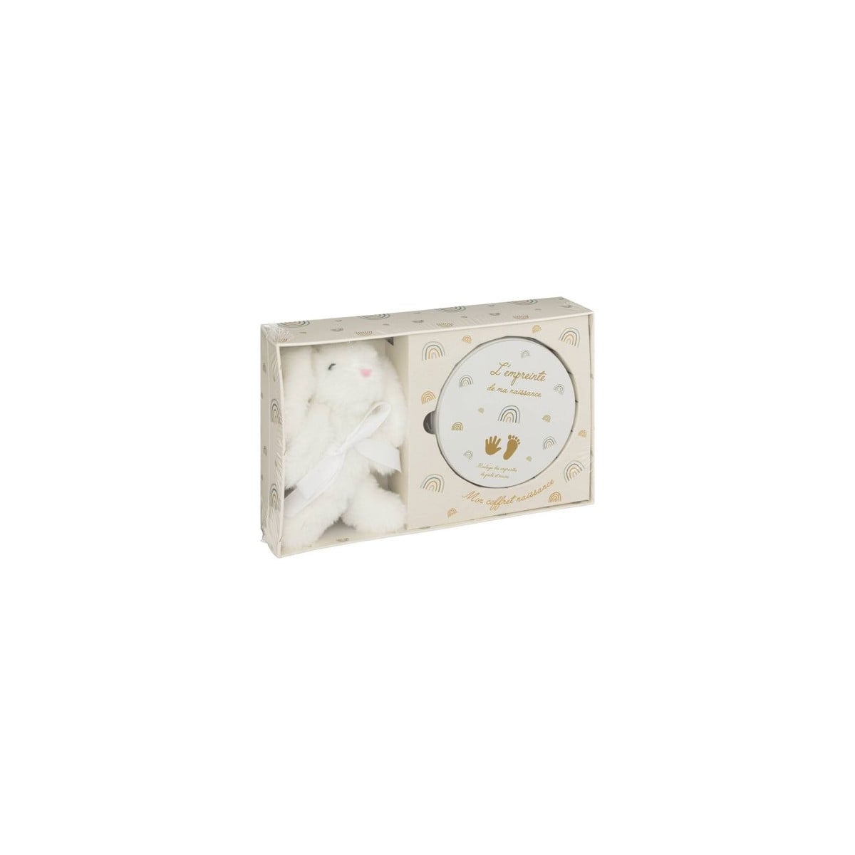Incluye un suave peluche blanco, perfecto como primer compañero del bebé, y todo lo necesario para capturar las huellas de sus manitas y piecitos en arcilla moldeable. La arcilla se endurece con el paso del tiempo, creando un recuerdo duradero que podrás conservar en su elegante caja metálica decorada con pequeños arcoíris en tonos suaves.