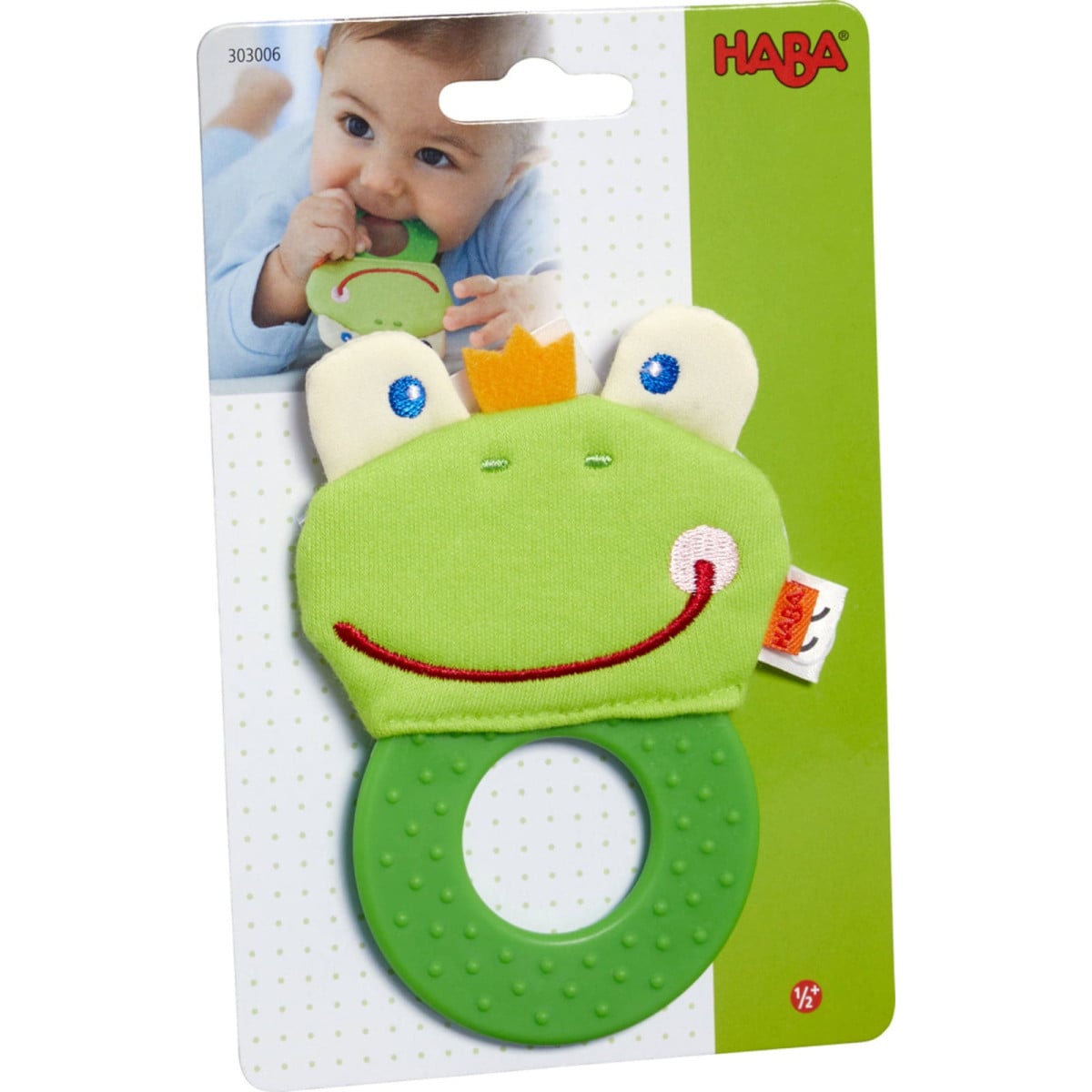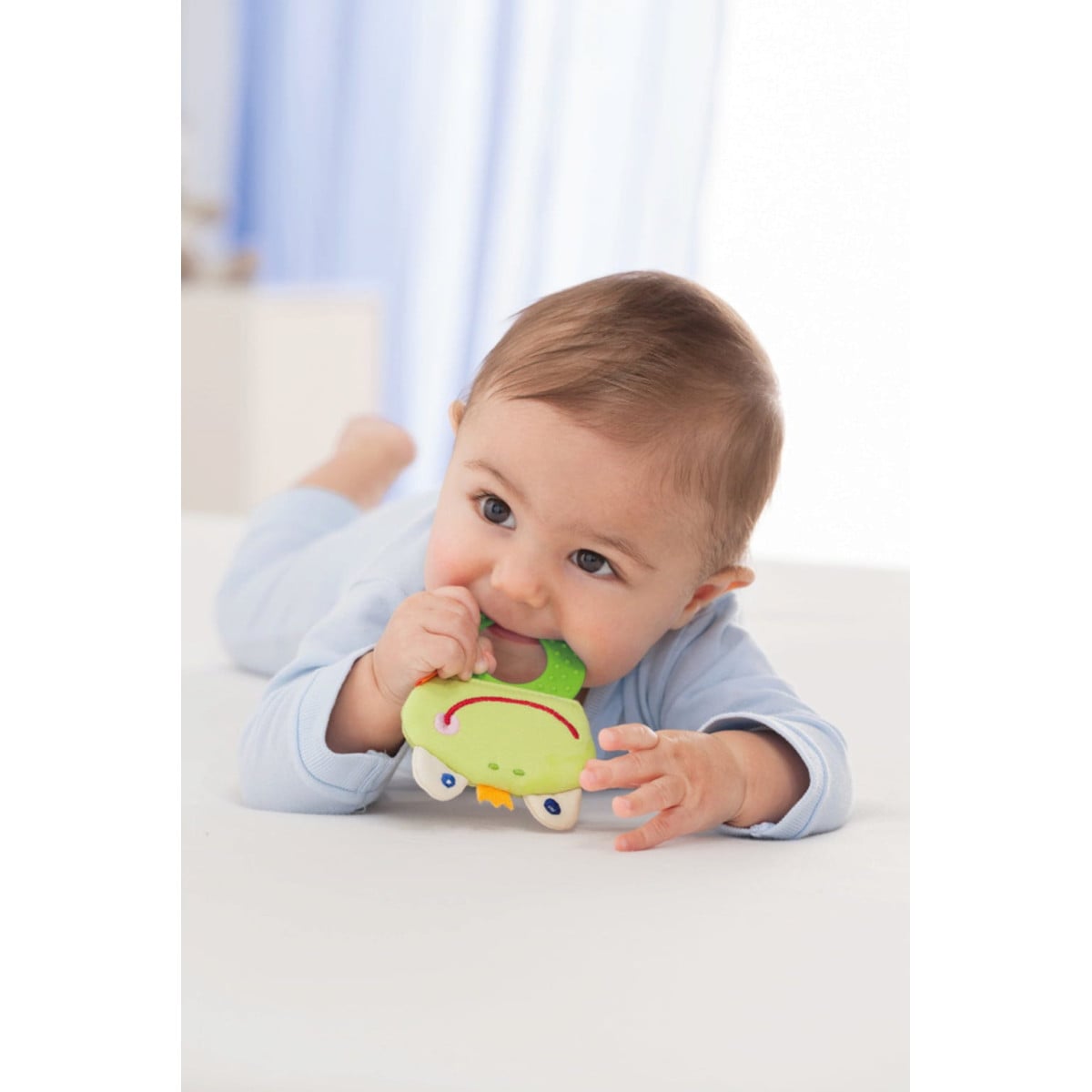 Mordedor HABA con forma de rana y texturas suaves que ayudan a calmar las encías del bebé. Fácil de agarrar y perfecto para estimular el juego sensorial y la motricidad fina.