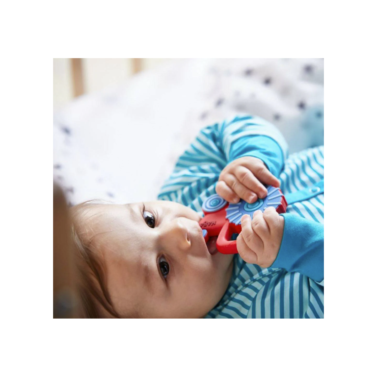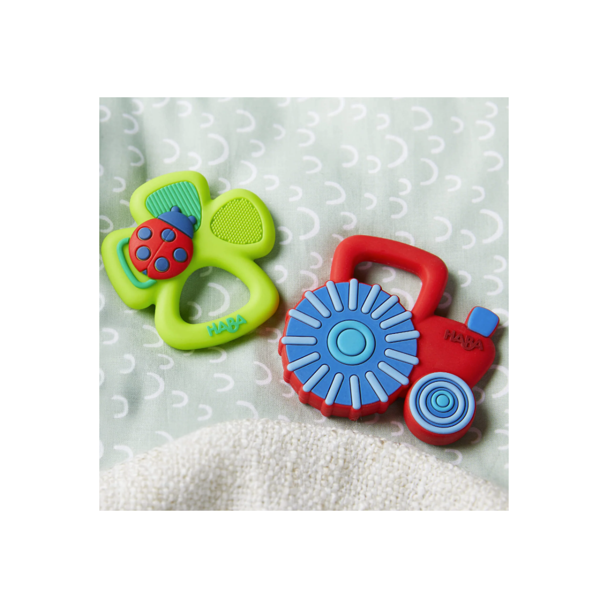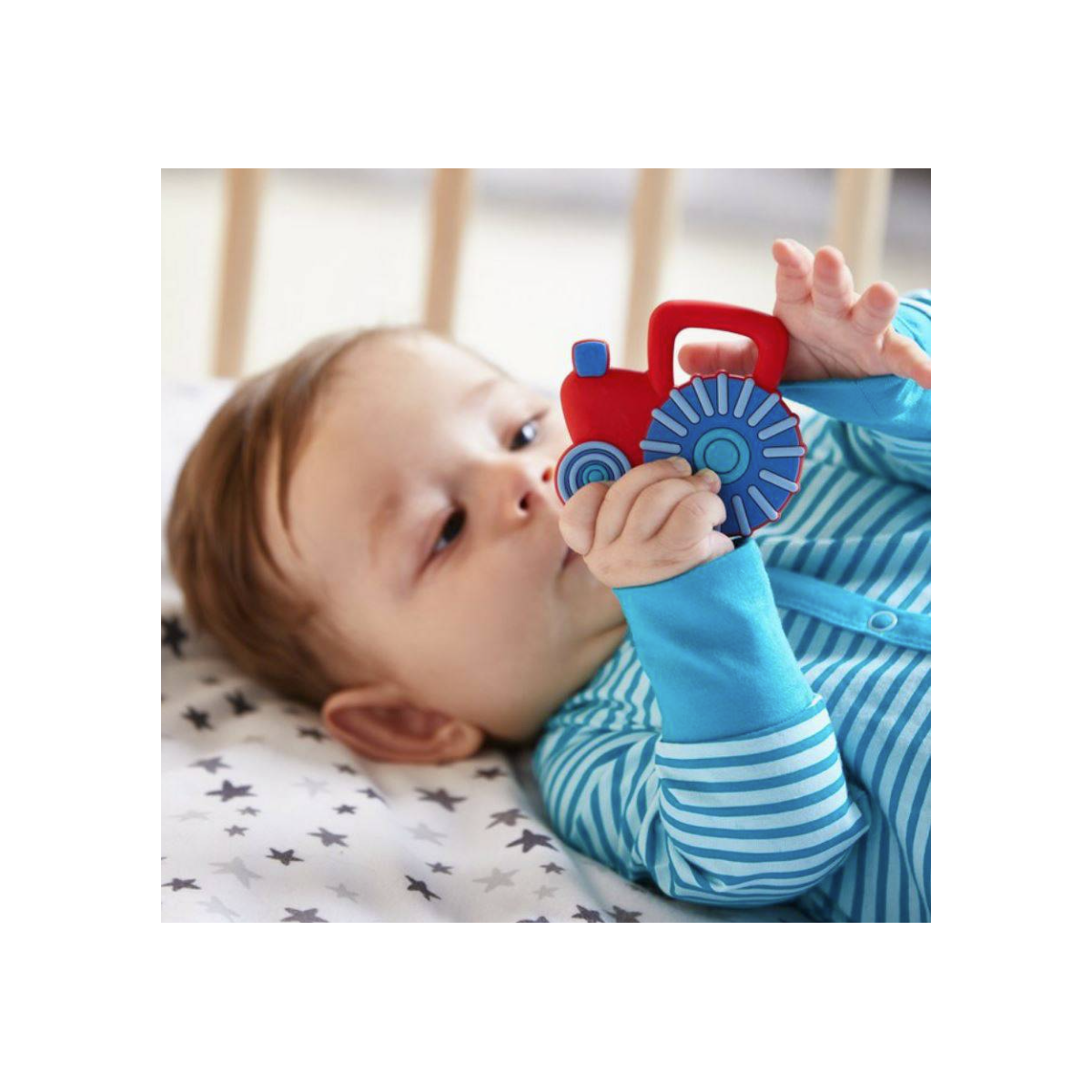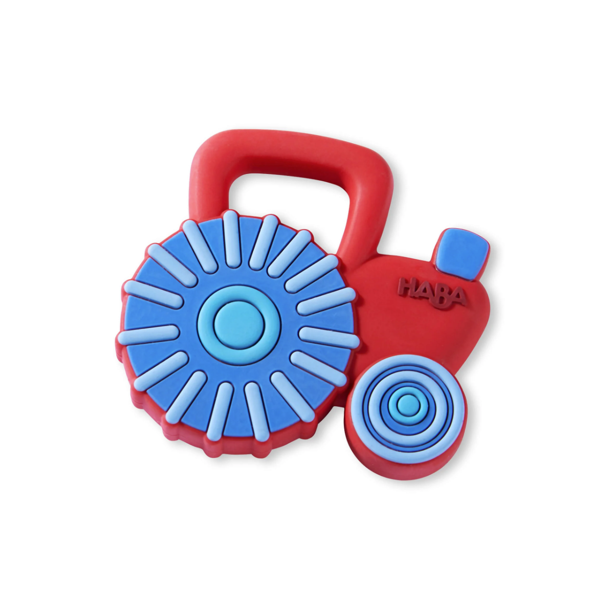 Mordedor HABA con forma de tractor y diferentes texturas que ayudan a calmar las encías del bebé. Fácil de agarrar y perfecto para estimular la exploración y la motricidad fina.