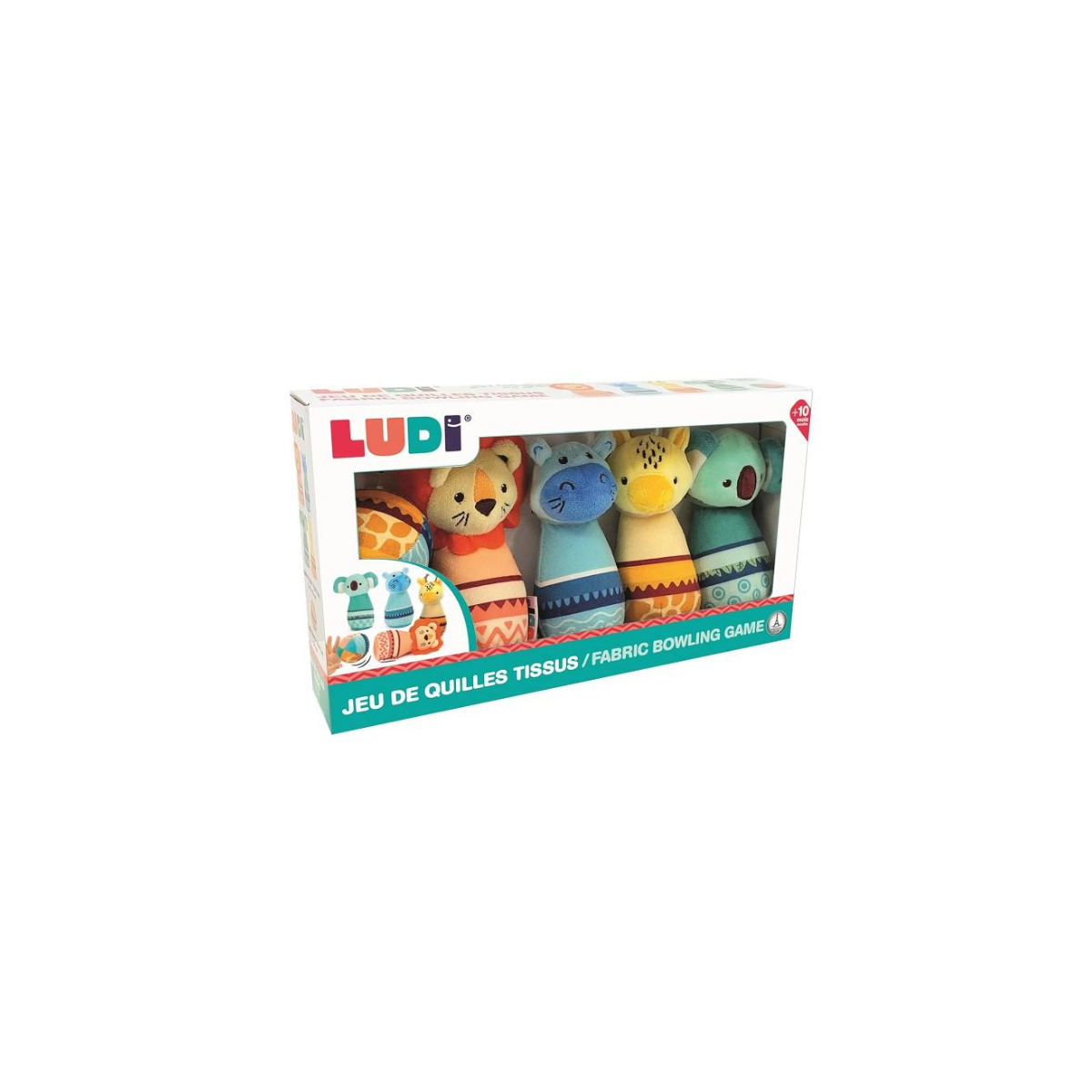 Juego de bolos de Ludi con 4 divertidos animales y pelota blanda incluida. Ideal para niños y niñas desde 10 meses, ayuda a desarrollar coordinación, puntería y motricidad de forma segura y divertida.