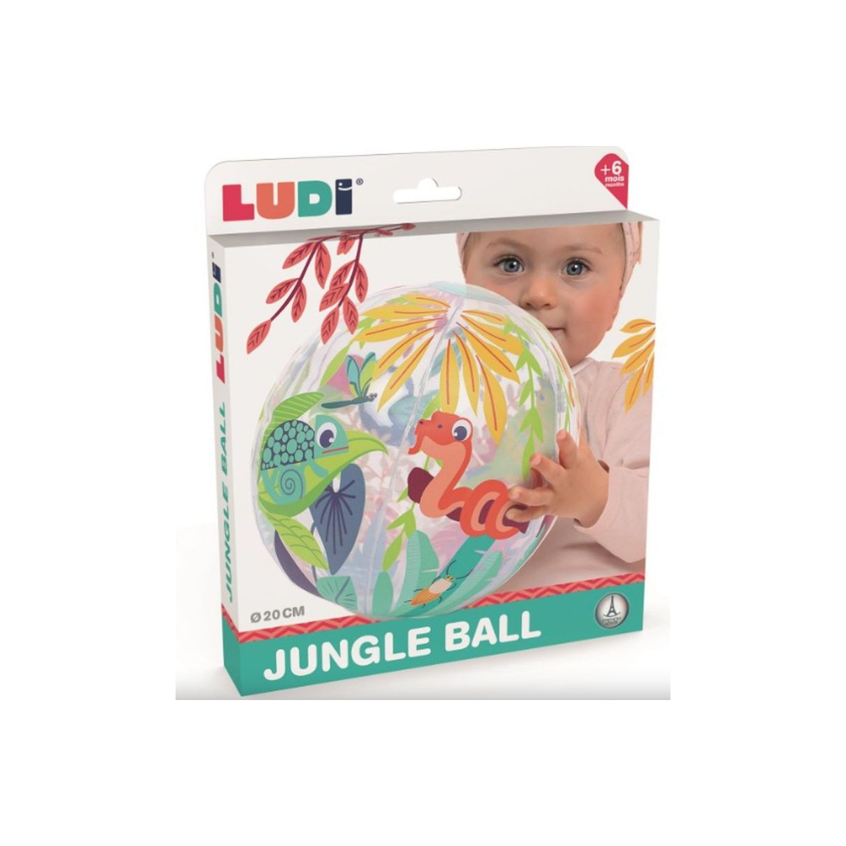 Pelota hinchable Jungle Ball Ludi de 20 cm con diseño de selva. Ligera y fácil de agarrar, ideal para niños y niñas desde 6 meses para estimular la coordinación y el juego activo.