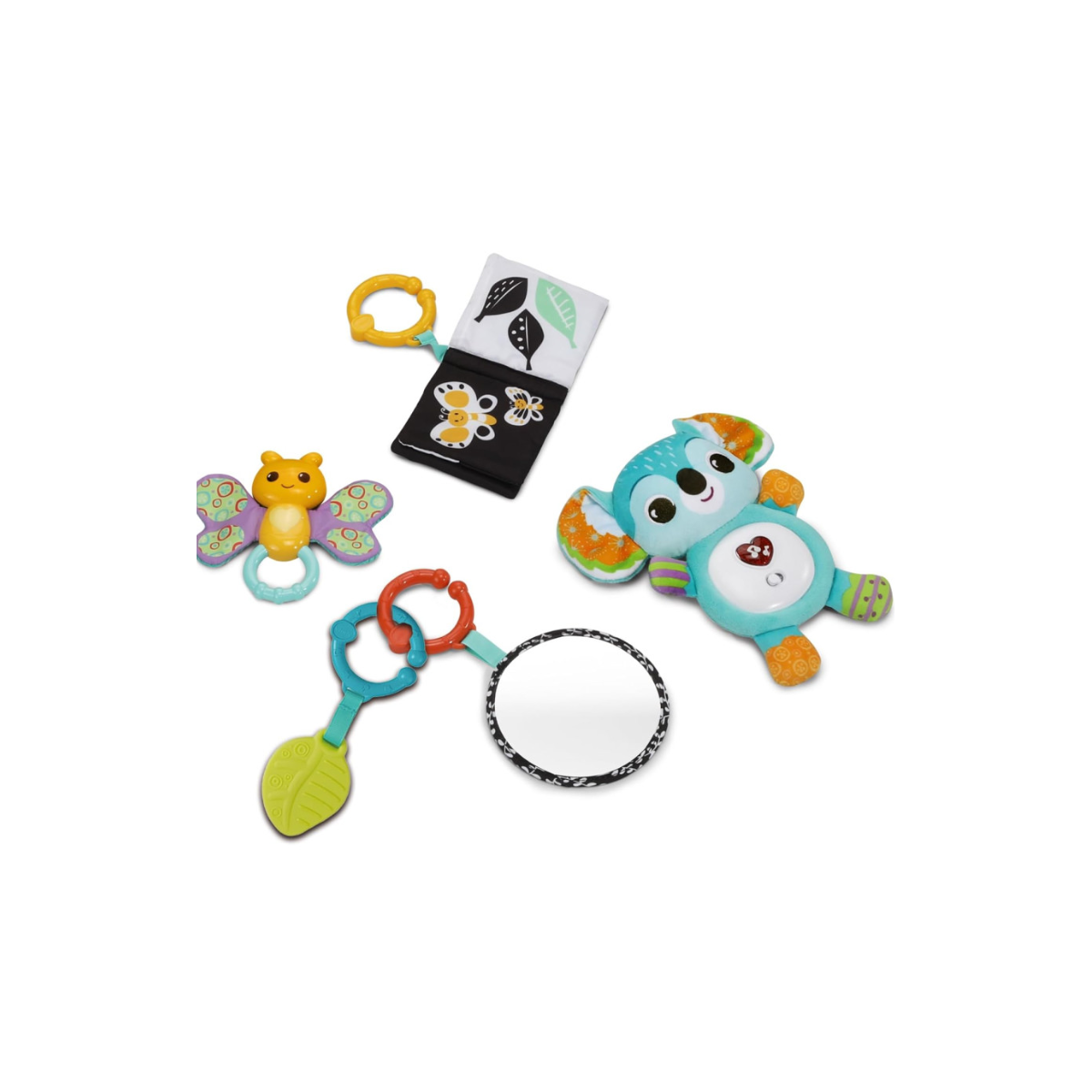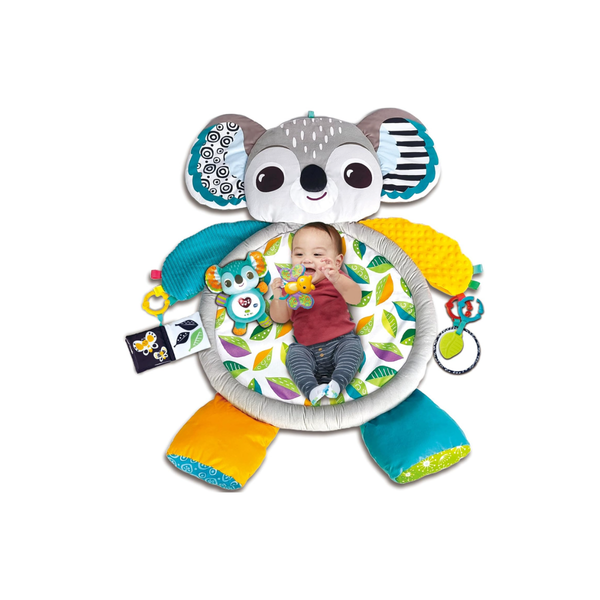Incluye un muñeco musical con voz, un espejo para el autodescubrimiento, un librito blandito con anilla, una mariposa con sonajero, un mordedor en forma de hoja y un aro texturizado. Además, el muñeco koala cuenta con más de 45 canciones, sonidos y frases que se activan con solo presionar su pancita. Toda la superficie es blandita, lavable y con detalles pensados para estimular el tacto y la vista, desde contrastes en blanco y negro hasta colores vivos que llaman la atención desde los primeros días.