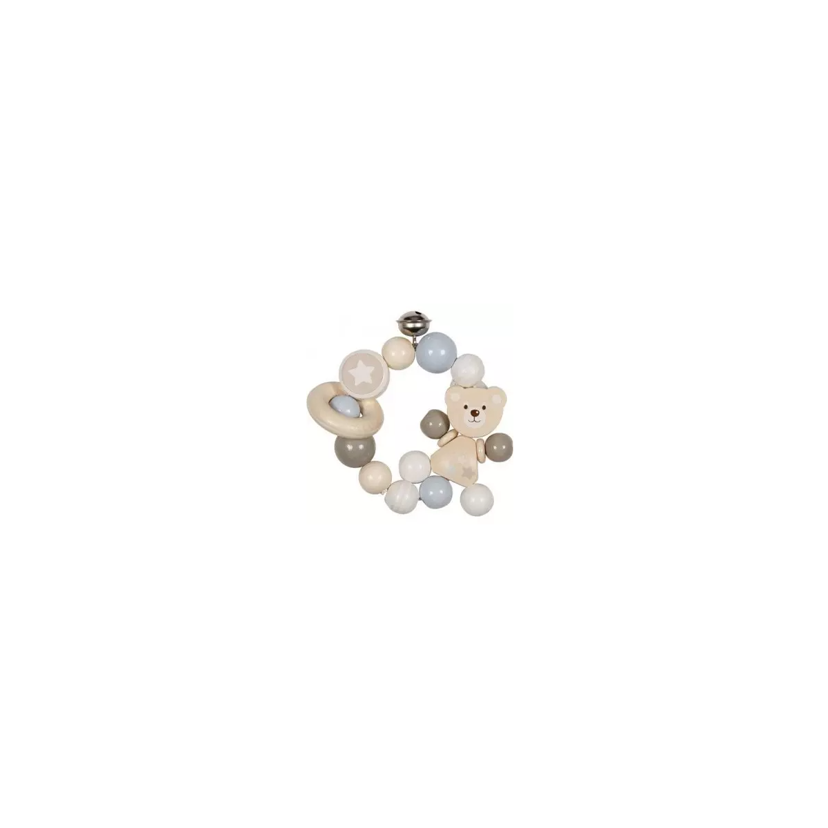 Un sonajero elástico de madera decorado con un osito.