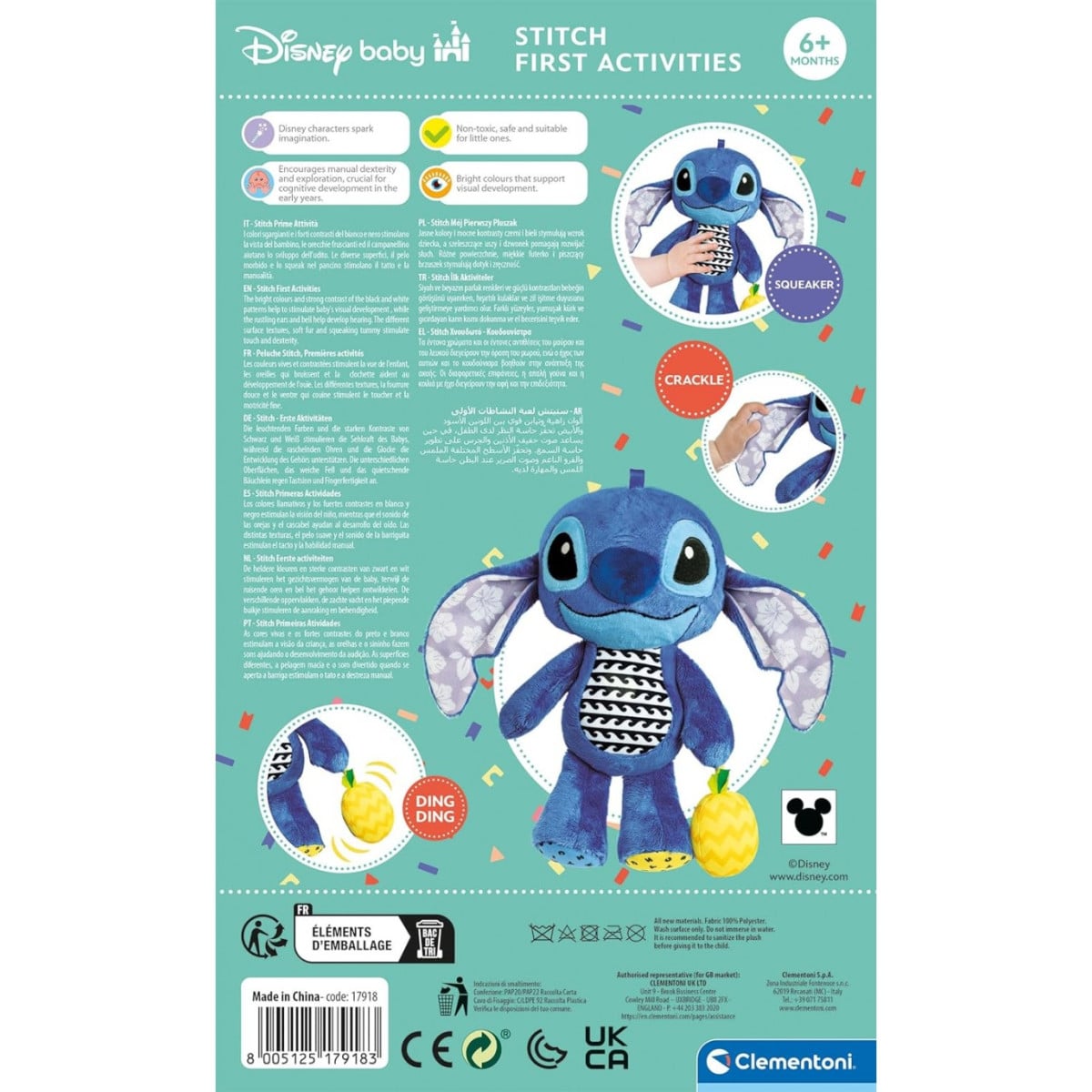 Este peluche de actividades está fabricado con materiales suaves y seguros, perfectos para que los bebés lo abracen y jueguen con él. Su diseño colorido y atractivo capta la atención de los niños, invitándolos a interactuar con las diferentes texturas y elementos incorporados. Stitch viene equipado con múltiples actividades que fomentan el tacto y la exploración sensorial.