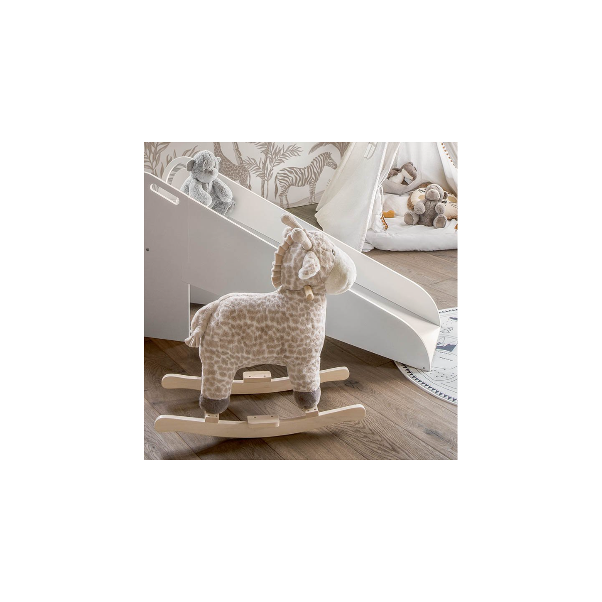 En este modelo, Atmosphera integra un peluche suave y agradable al tacto con una base que gira y se balancea con facilidad, lo que hace que cada momento sobre el balancín sea una experiencia cómoda y divertida. Las orejas y el cuello largo de la jirafa añaden personalidad y encanto, lo que invita a los peques a abrazar, sentarse o jugar con la figura incluso cuando no están balanceándose. El montaje es sencillo y la estructura está pensada para uso infantil bajo supervisión de un adulto, para que cada momento de juego sea seguro y lleno de sonrisas.