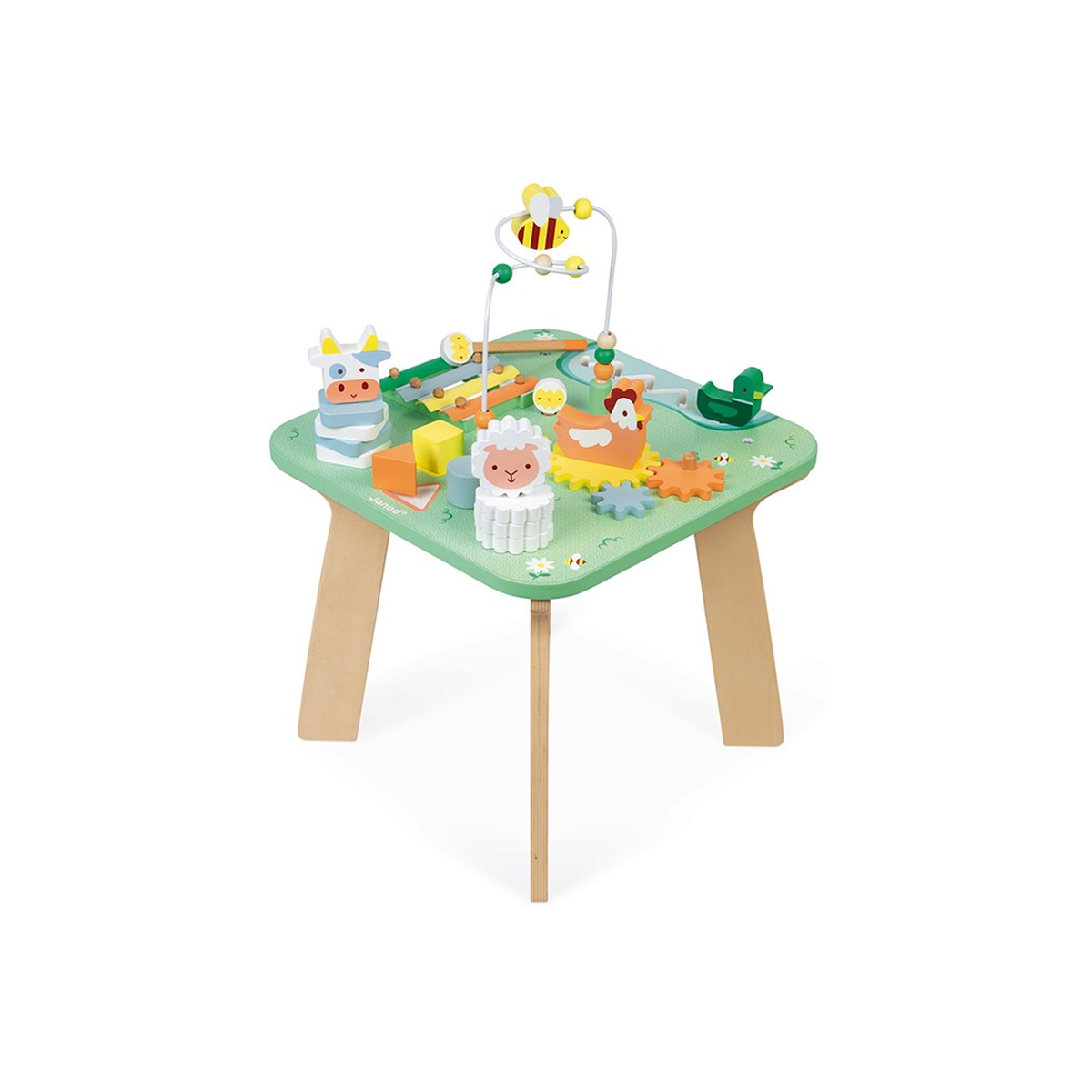 Está repleta de actividades, con ella los peques de la casa podrán apilar distintas piezas, empujar un patito por su recorrido en el río, manipular engranajes, encajar piezas de distintas formas, jugar con un ábaco, y hasta aprender a tocar un xilófono.