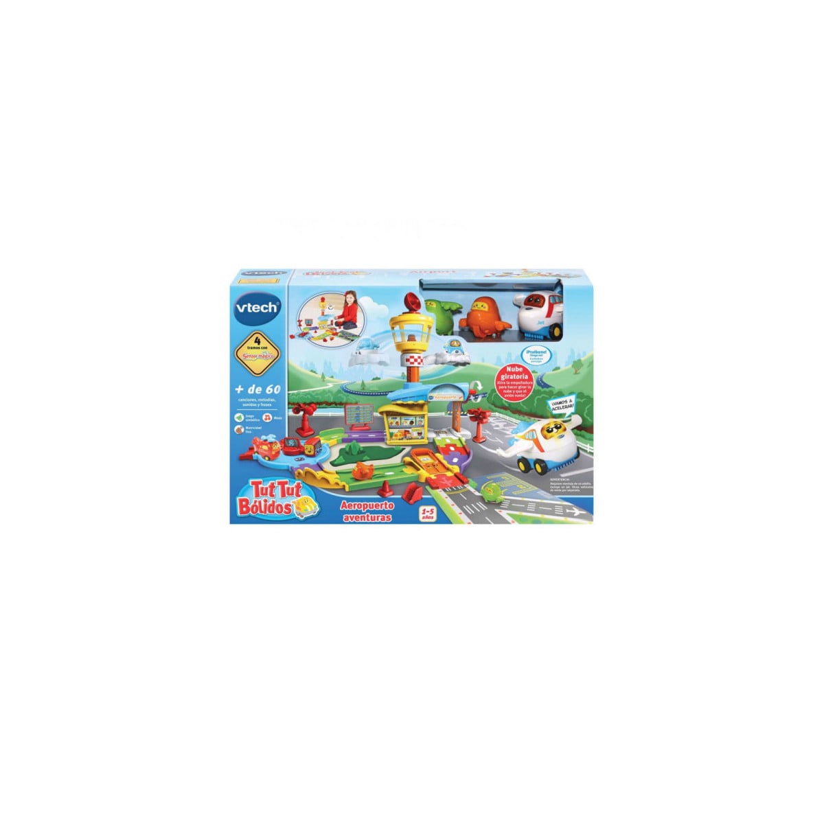 - Incluye: 1 plataforma de lanzamiento, 1 jet, manta de juego de pista, 1 nube giratoria, 1 rotonda, 1 vehículo Tut Tut.