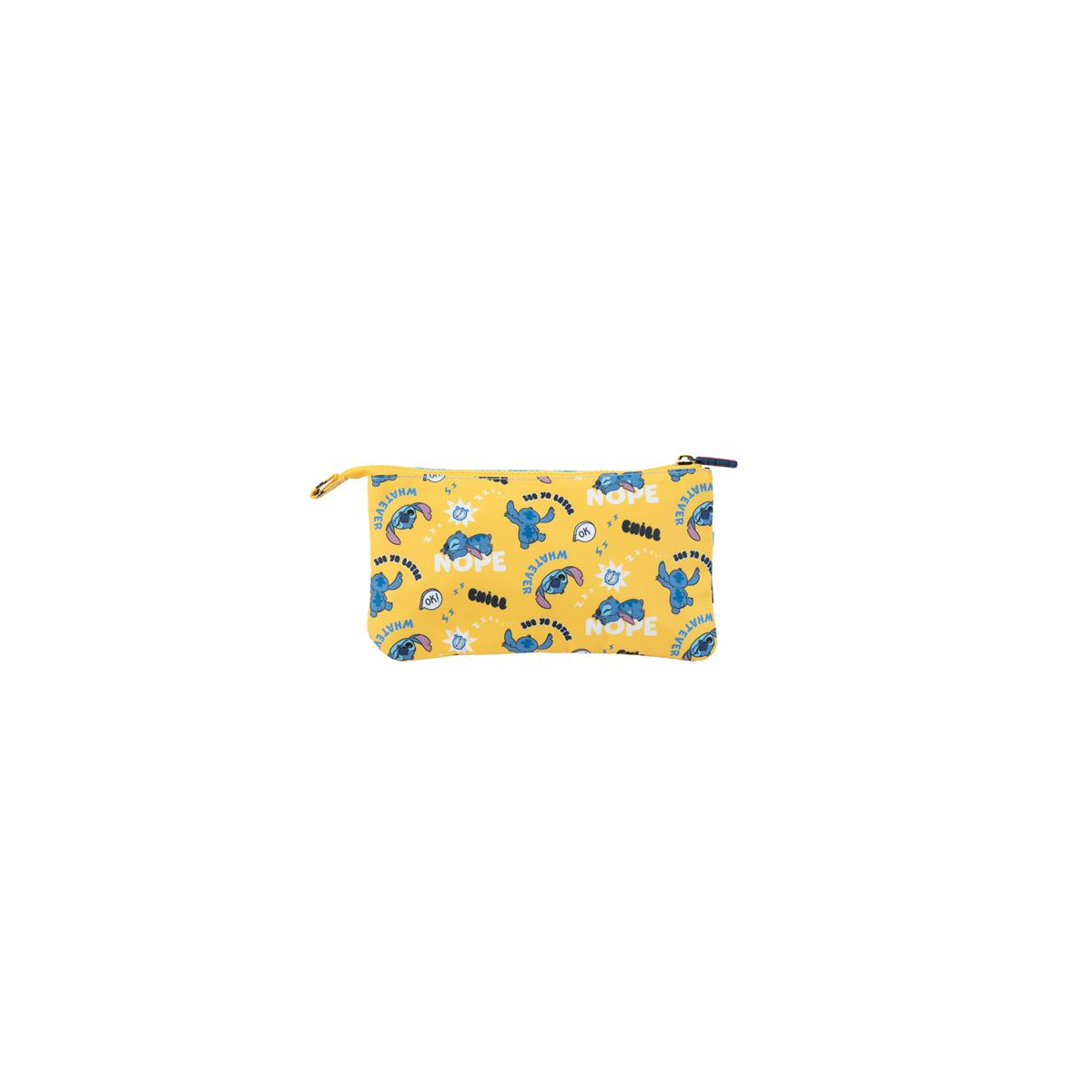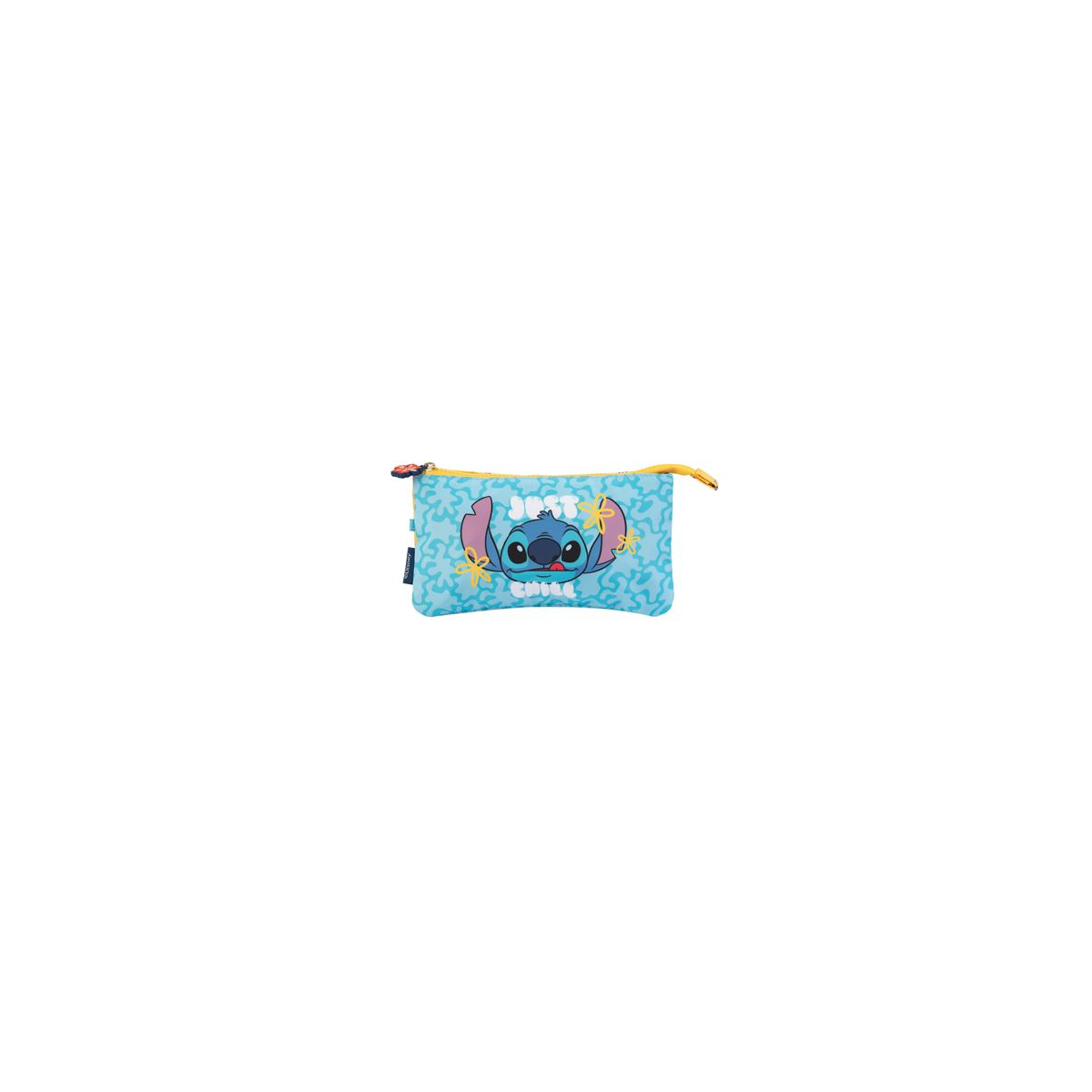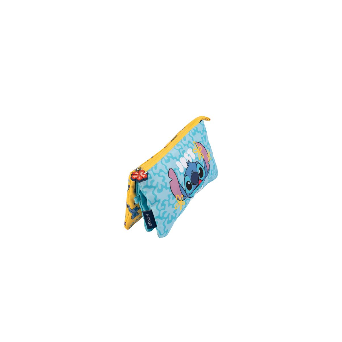 El exterior del estuche está decorado con un estampado tropical llamativo, que incluye la ilustración de Stitch entre colores brillantes que evocan un ambiente fresco y veraniego. Este diseño no solo hace que el estuche sea atractivo para niños y adolescentes, sino que también promueve un sentido de estilo personalizado en el entorno escolar.