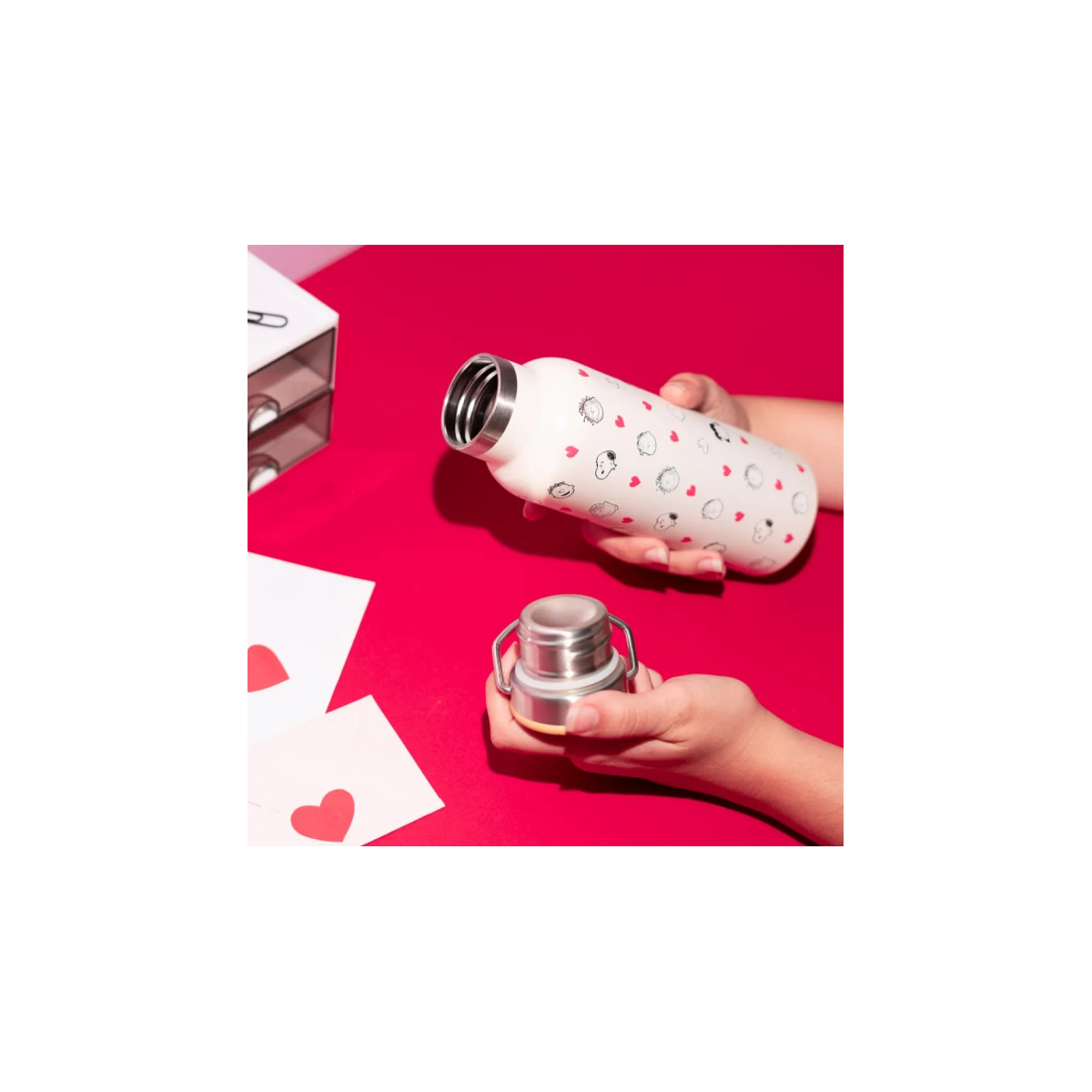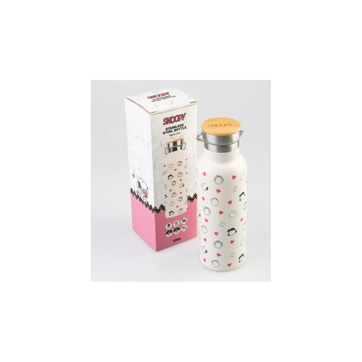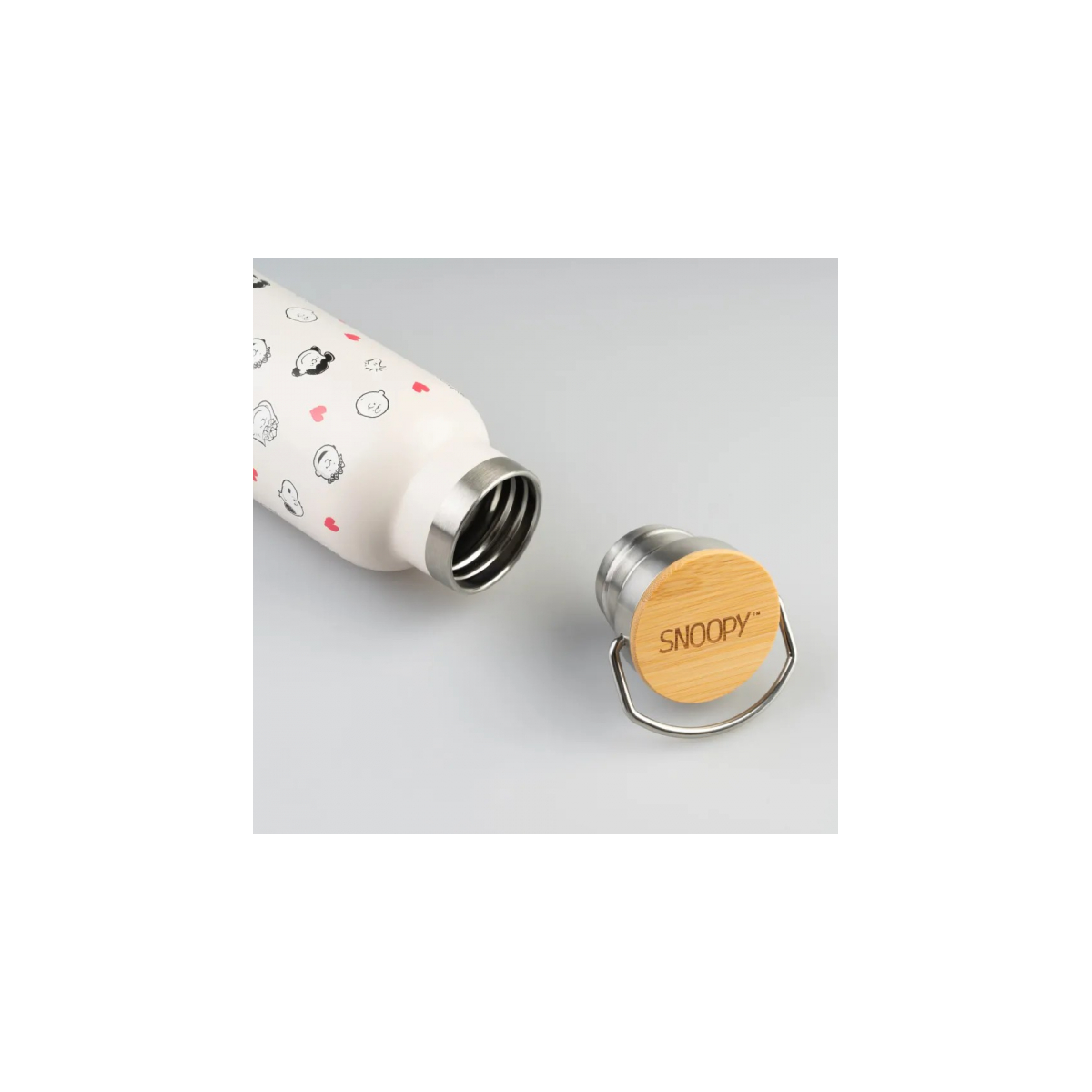 - Diseño: Botella térmica decorada con Snoopy y corazones, con un estilo tierno y original ideal para regalar.