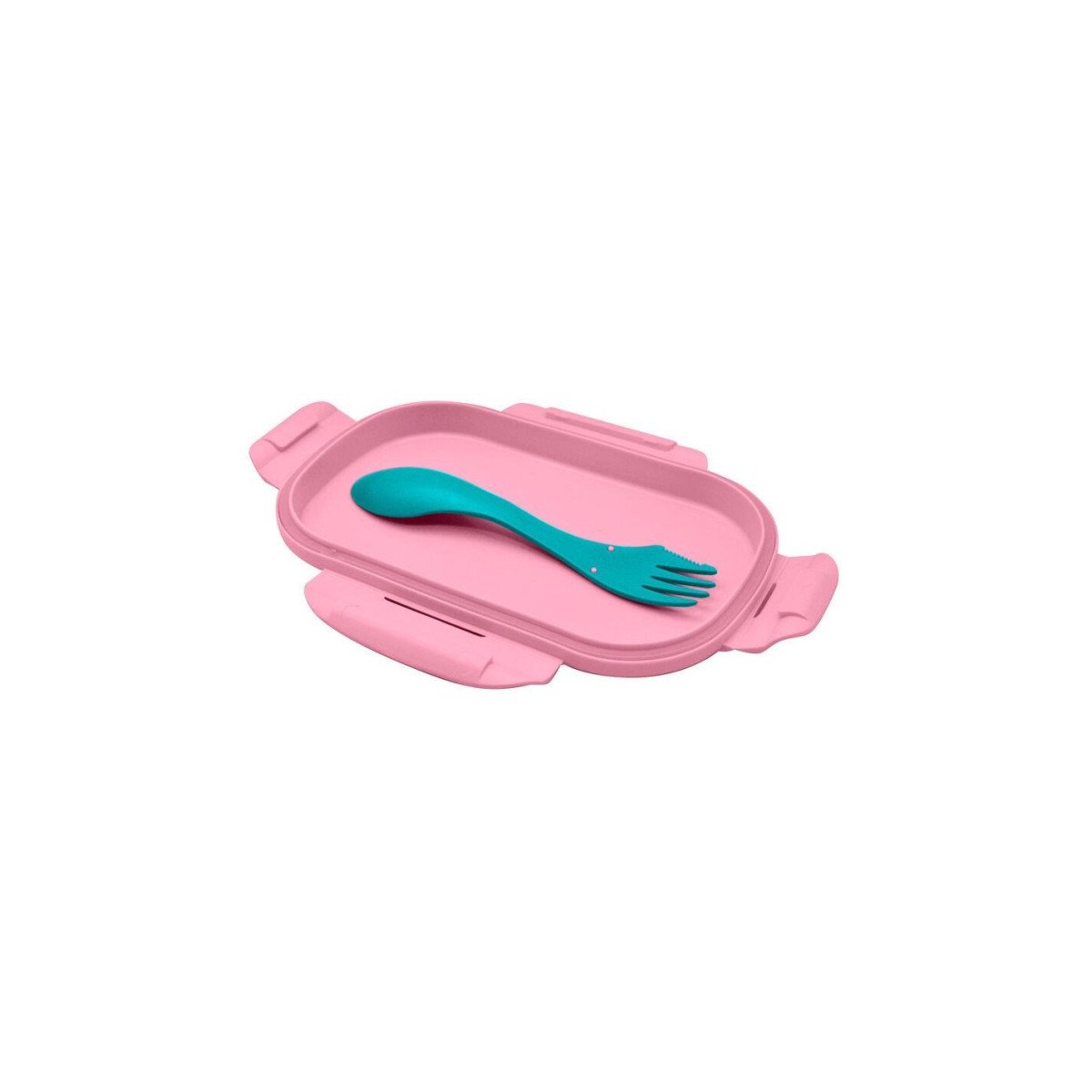 La sandwichera está equipada con un compartimento principal que mantiene el sándwich fresco y protegido durante el transporte, mientras que los cubiertos incluidos están diseñados para facilitar la comida en cualquier momento.