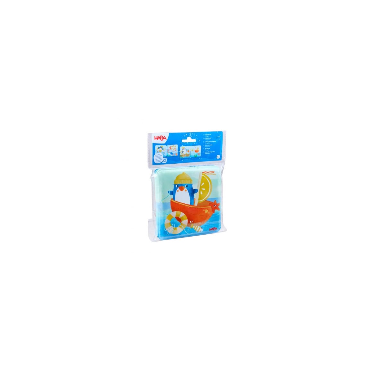 Libro para el baño Pingüino de HABA para bebés y niños pequeños. Sus páginas impermeables muestran divertidas escenas y además incluye un chirriador que hace el juego aún más entretenido.