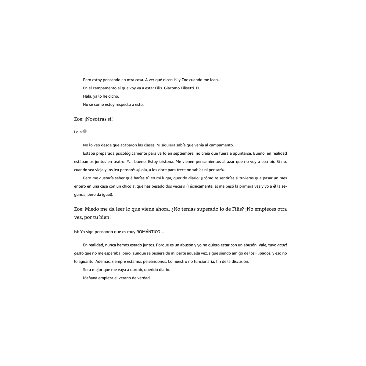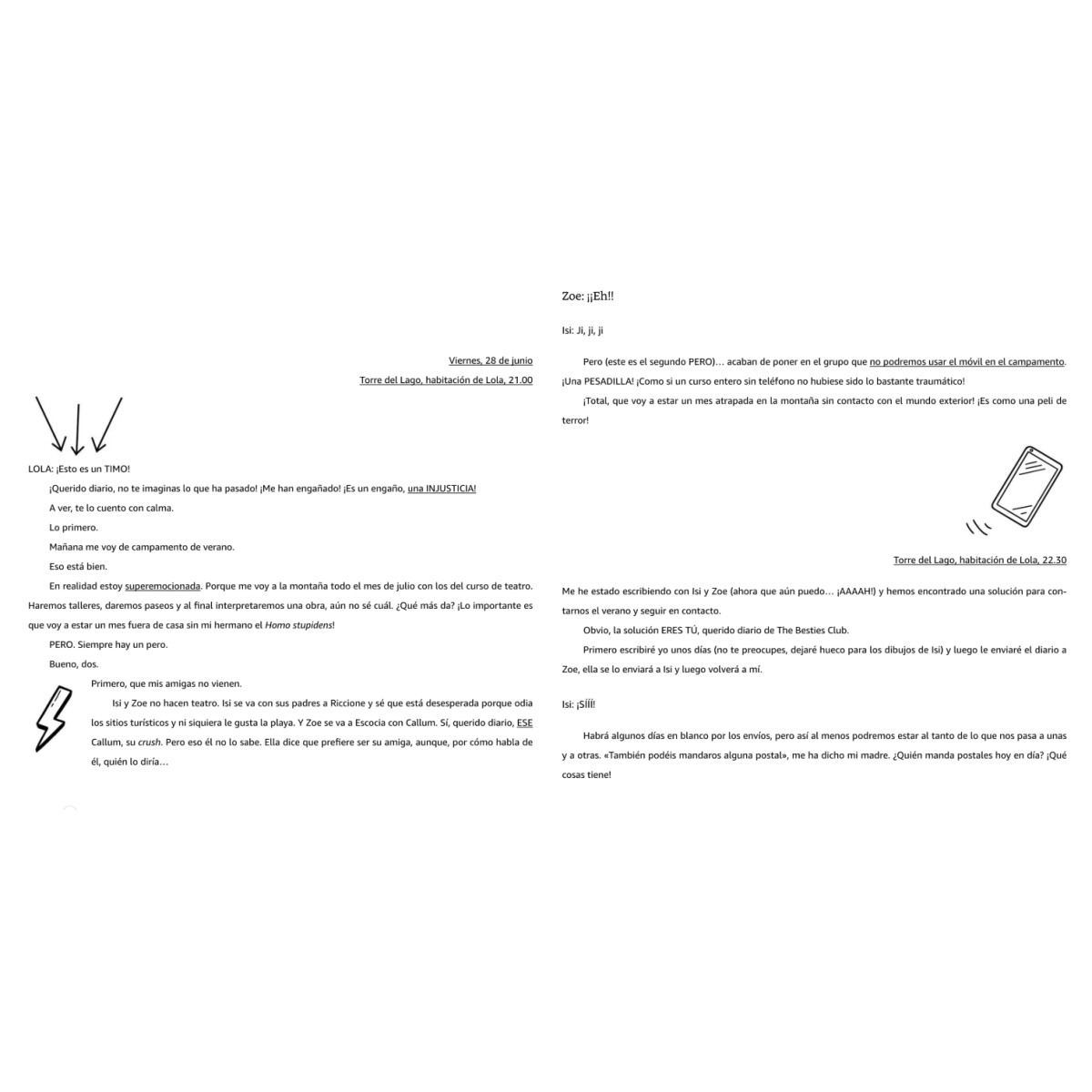 Lola está emocionada porque se va a un campamento en la montaña, Isi tendrá que pasar sus días en un complejo turístico junto al mar y Zoe viajará nada menos que a Escocia. Todo suena genial, pero hay un gran problema: ¡no podrán usar el móvil! Para unas amigas acostumbradas a estar siempre conectadas, esto supone todo un reto.