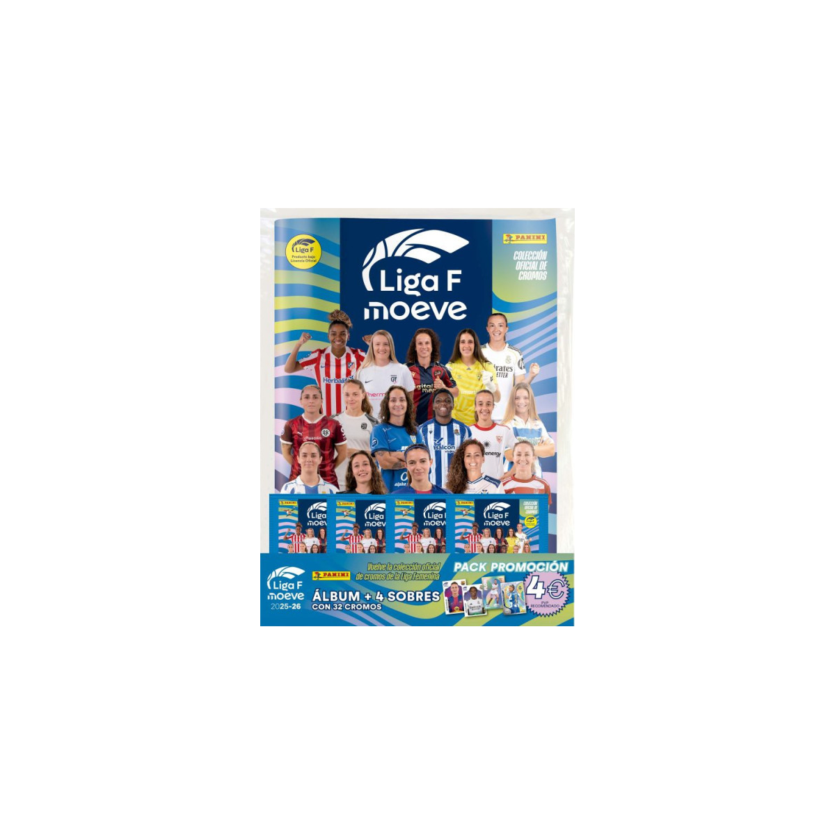 Álbum oficial Liga F Moeve 2025-2026 Panini con 4 sobres incluidos y 32 cromos. Empieza la colección del fútbol femenino y completa tu álbum con las estrellas de la temporada.