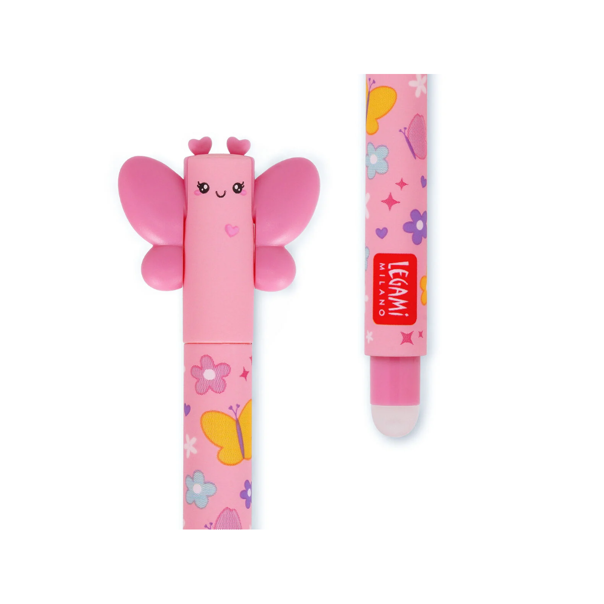 De los errores se aprende… ¡y se borran al instante con el Bolígrafo Gel Borrable Mariposa Legami! Este precioso bolígrafo combina la elegancia de una mariposa con la practicidad de una escritura limpia y sin errores. Su tinta de gel termosensible rosa desaparece fácilmente gracias a la esfera borradora situada en el extremo, permitiéndote corregir sin esfuerzo y mantener tus notas impecables.