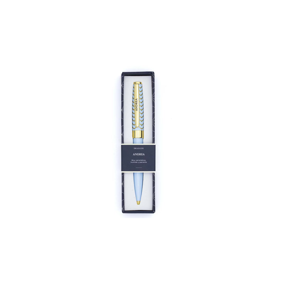 Un toque de estilo en cada palabra. El Bolígrafo Nombre Andrea en azul claro con detalles dorados de Draeger es el complemento perfecto para quienes valoran la papelería bonita, funcional y con personalidad. Su diseño suave y delicado lo convierte en una opción ideal para agendas, cuadernos o para regalar con cariño en cualquier ocasión especial.
