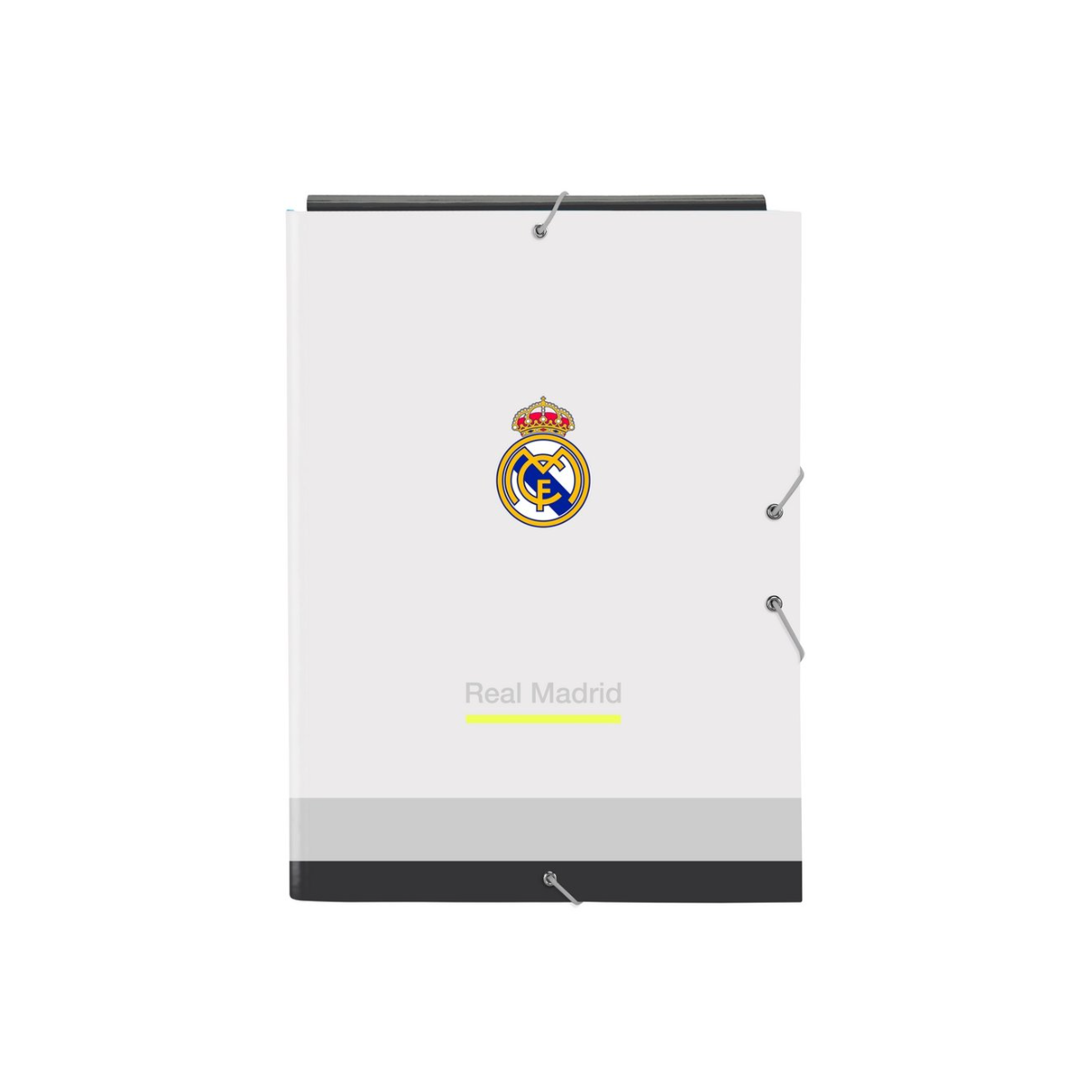 Mantén tus documentos protegidos y demuestra tu pasión blanca con la Carpeta Folio 3 Solapas Real Madrid, práctica, resistente y con estilo único.
