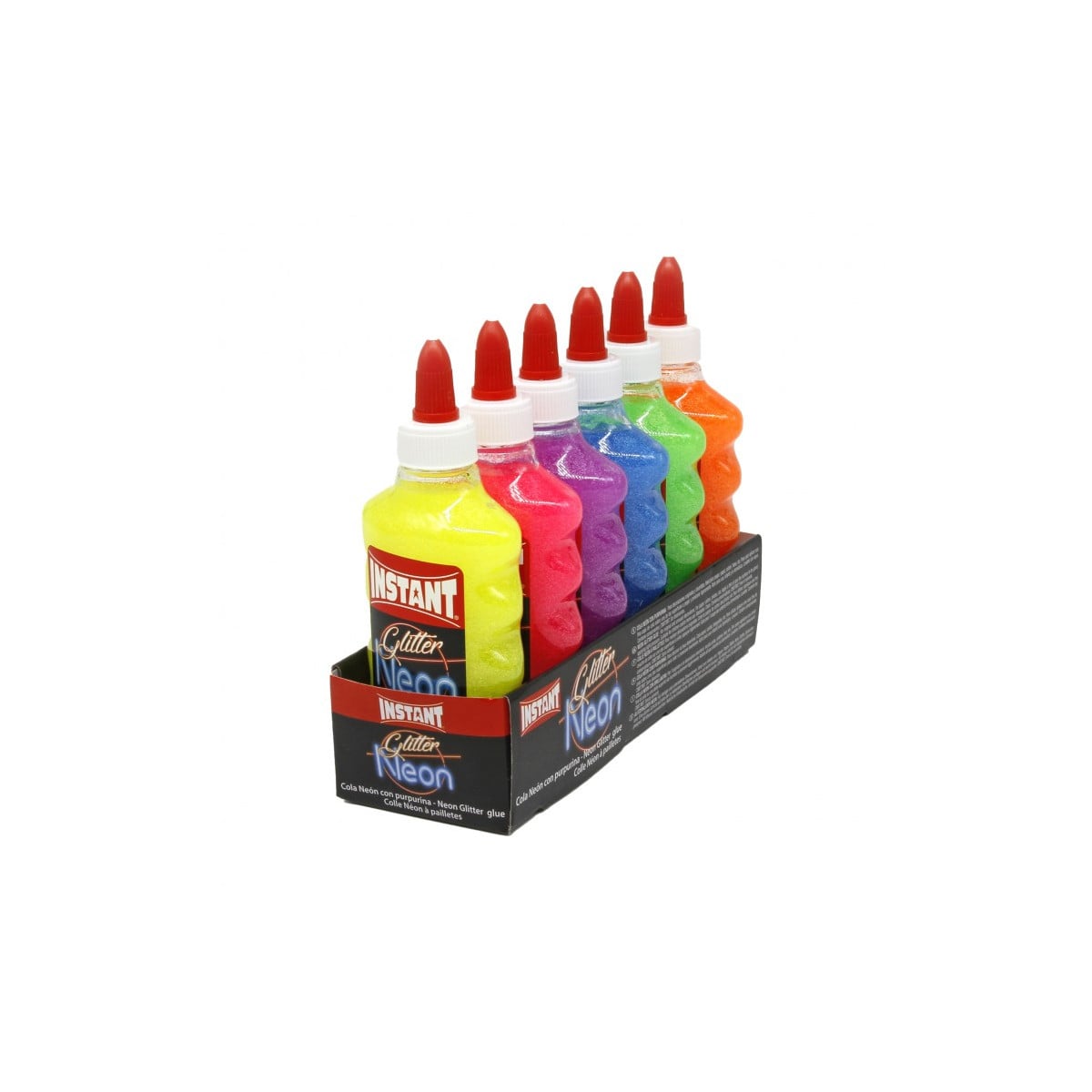 Cola Neon con purpurina Instant de 180 ml que brilla bajo luz ultravioleta. Ideal para manualidades en papel, cartón o tela. Pegamento sin disolventes. Colores surtidos.