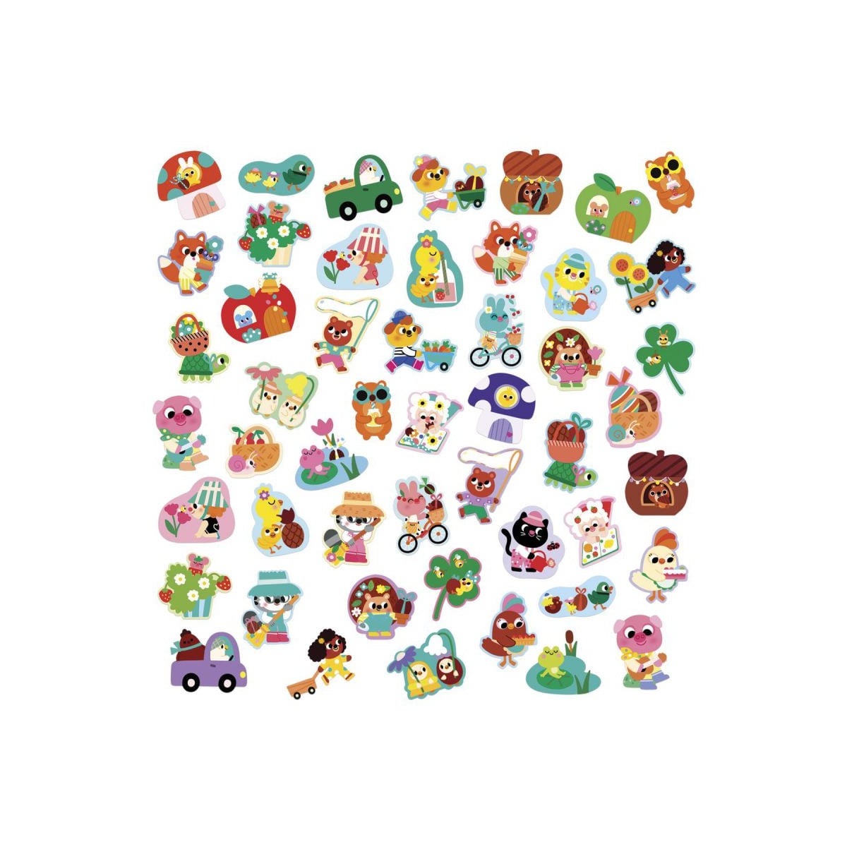 Set de 50 pegatinas grandes Primavera de Janod con flores, animales y elementos del jardín. Diseñadas para las manos de los más pequeños, ideales para crear dibujos y manualidades.