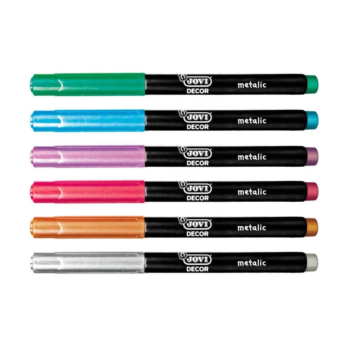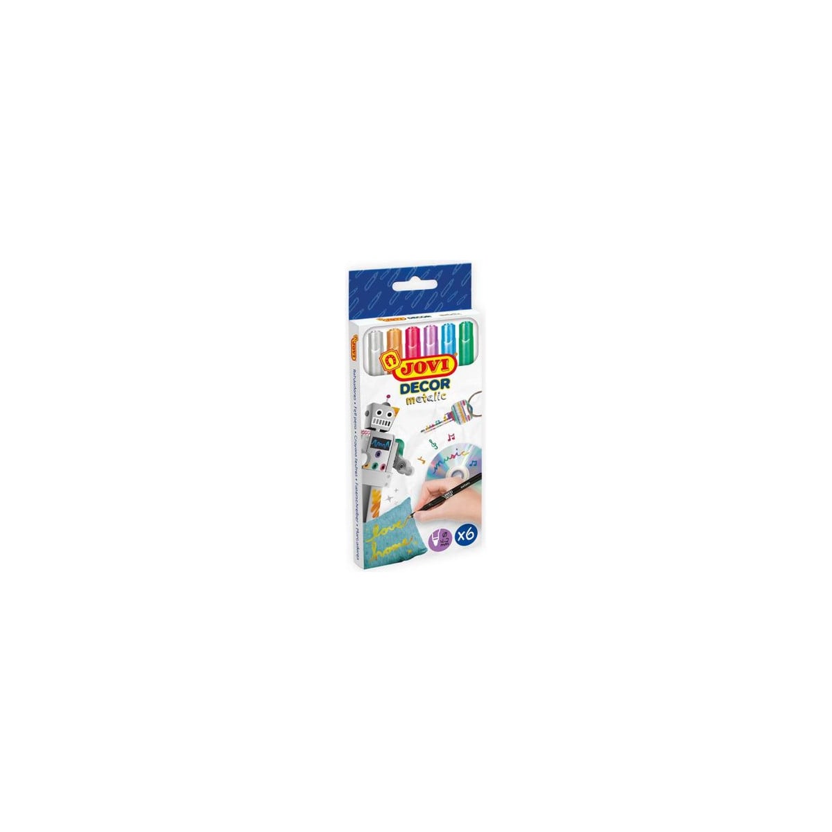 Estuche de 6 rotuladores Jovi Decor Metallic con tinta base agua y efecto metalizado. Ideales para decorar papel, cartulina, madera, vidrio o cerámica.