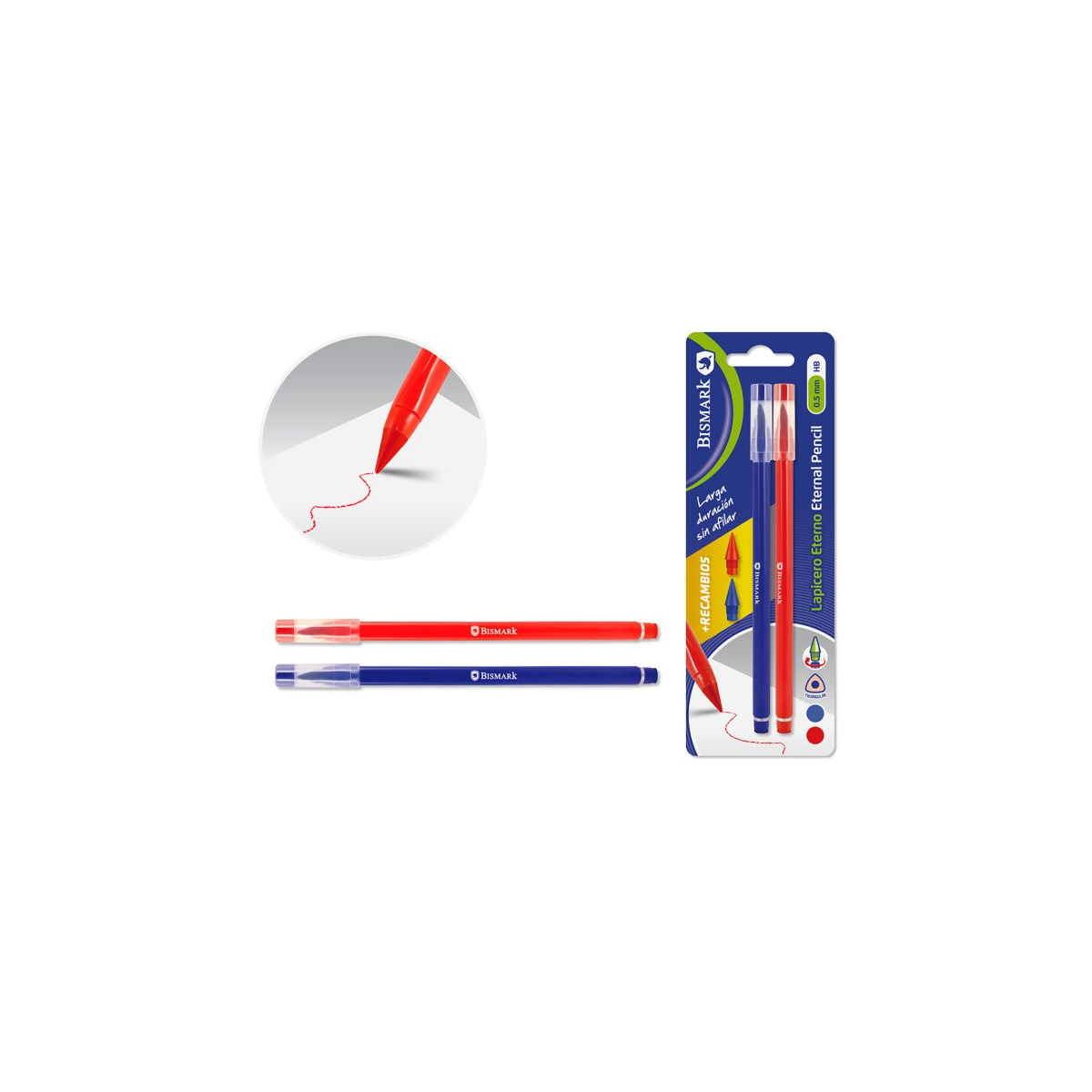 El Lapicero Eterno Mágico Rojo y Azul Bismark combina innovación y funcionalidad, siendo un imprescindible en estuches escolares, de oficina o de uso diario.