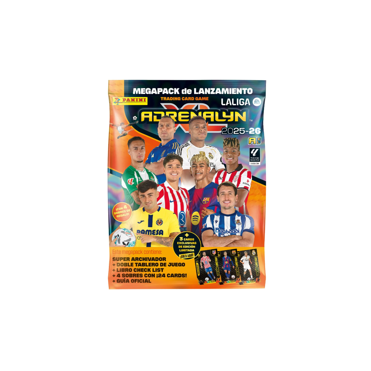 Megapack Adrenalyn XL LaLiga 2025-2026 Panini con archivador, tablero, guía y 4 sobres (24 cartas). Incluye 3 edición limitada exclusivas para empezar la colección a lo grande.