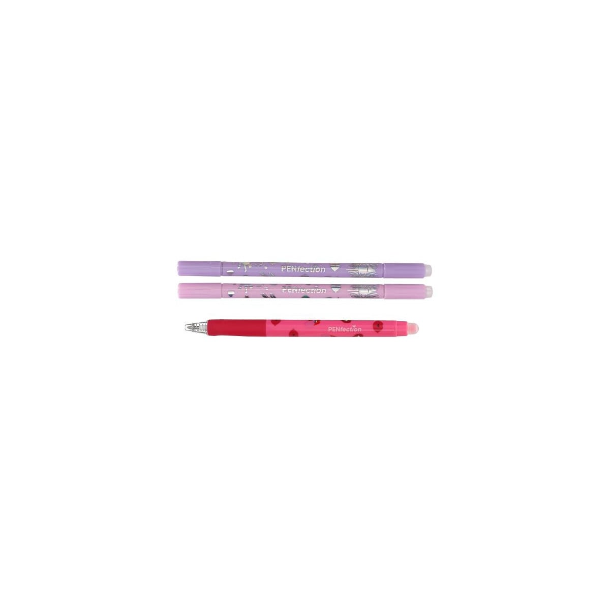El set incluye 1 bolígrafo y 2 rotuladores en tono lila con motivos gráficos y uno en rosa decorado con pequeños corazones. Son suaves al escribir y, gracias a la goma incorporada, permiten corregir sin manchar ni estropear las hojas. Es el pack ideal para quienes buscan materiales escolares bonitos, prácticos y funcionales, que acompañen cada jornada con un toque de color y estilo. Perfecto para regalar o para renovar el material del cole con algo diferente y muy útil.