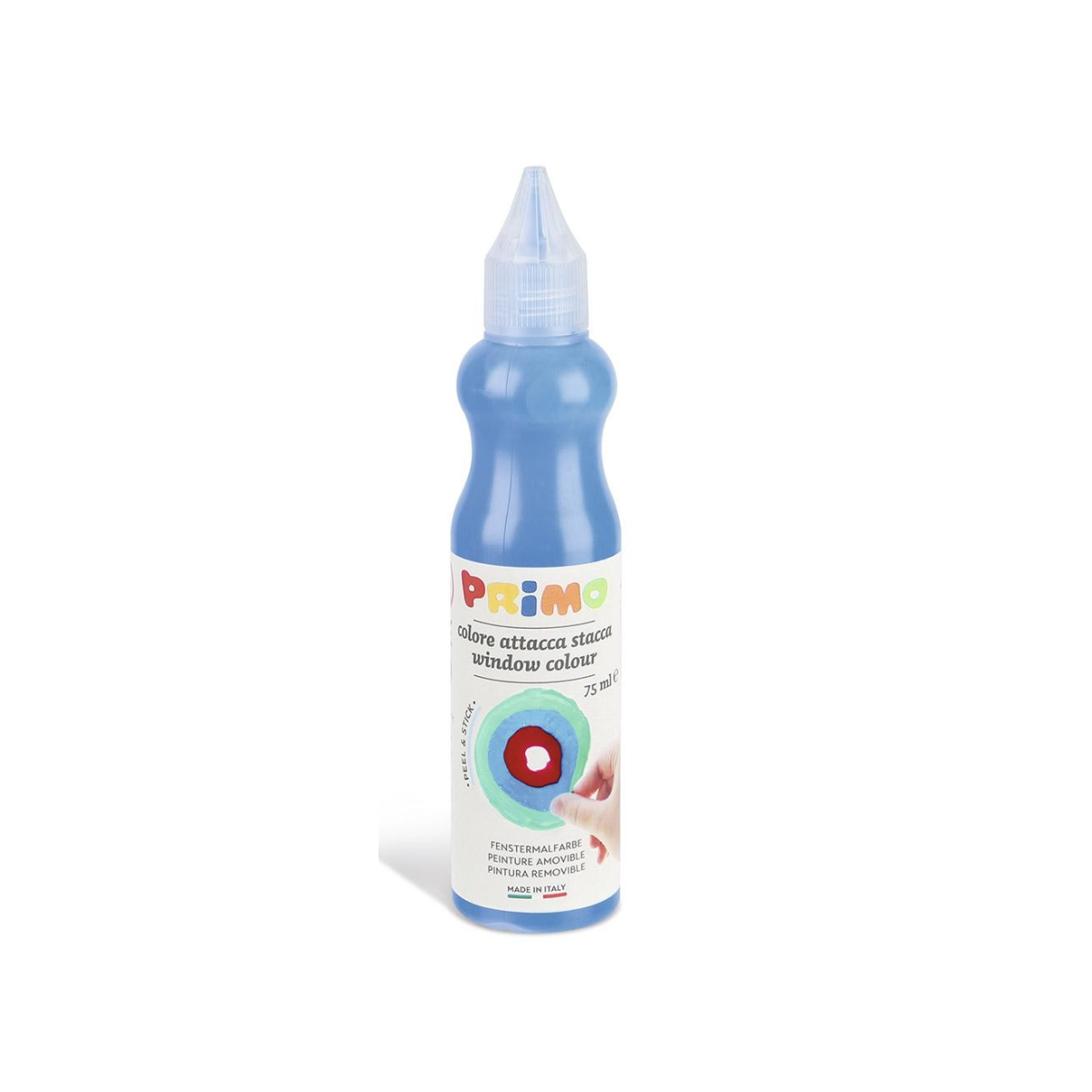 Crea y diviértete con la pintura para ventana azul de Primo, un bote de 75 ml removible que permite decorar, despegar y recolocar tus diseños fácilmente.
