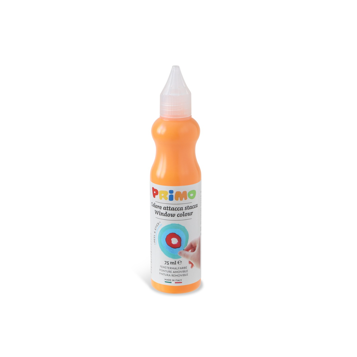 Deja volar la creatividad con la pintura para ventana naranja de Primo, un bote removible de 75 ml que permite decorar, despegar y recolocar sin ensuciar.