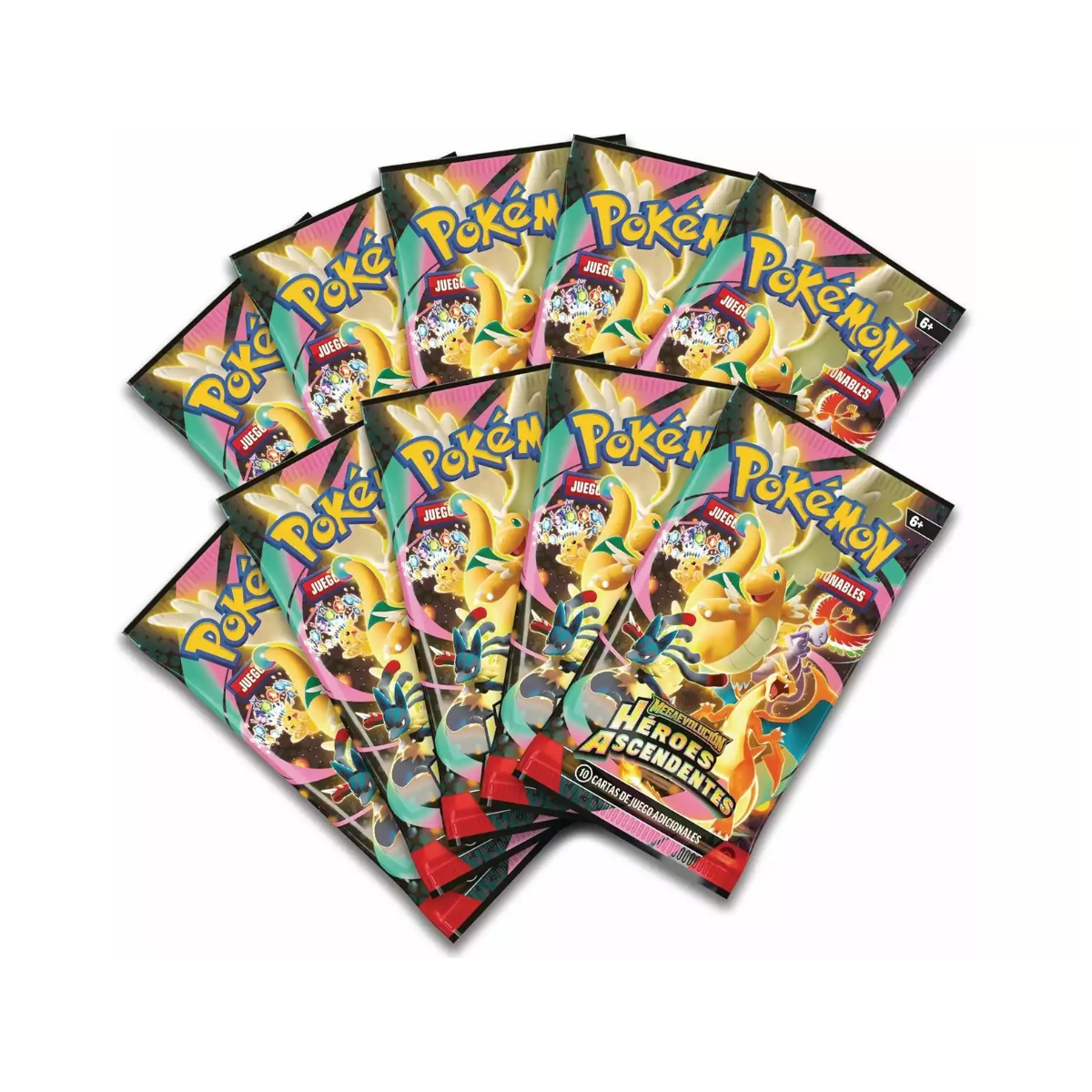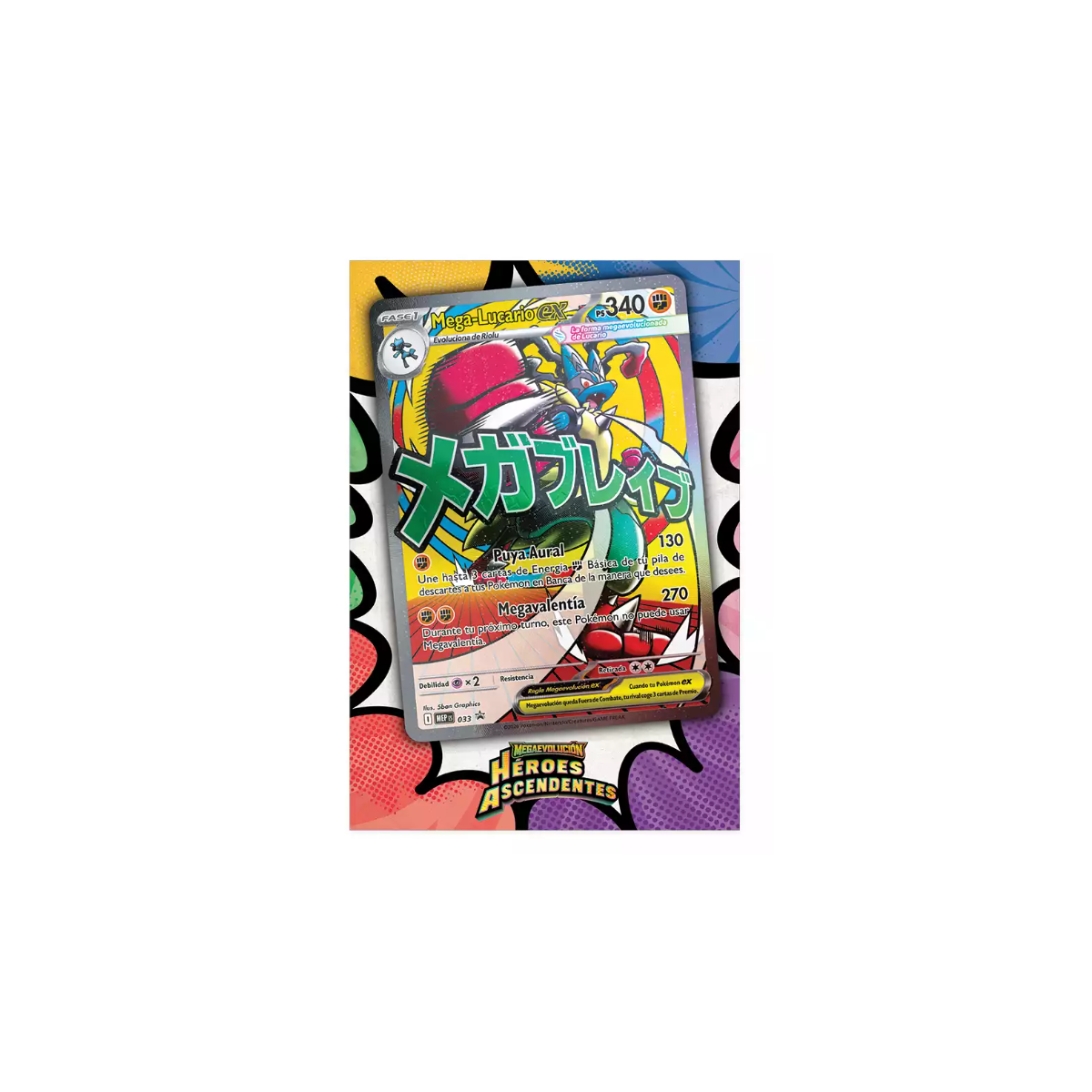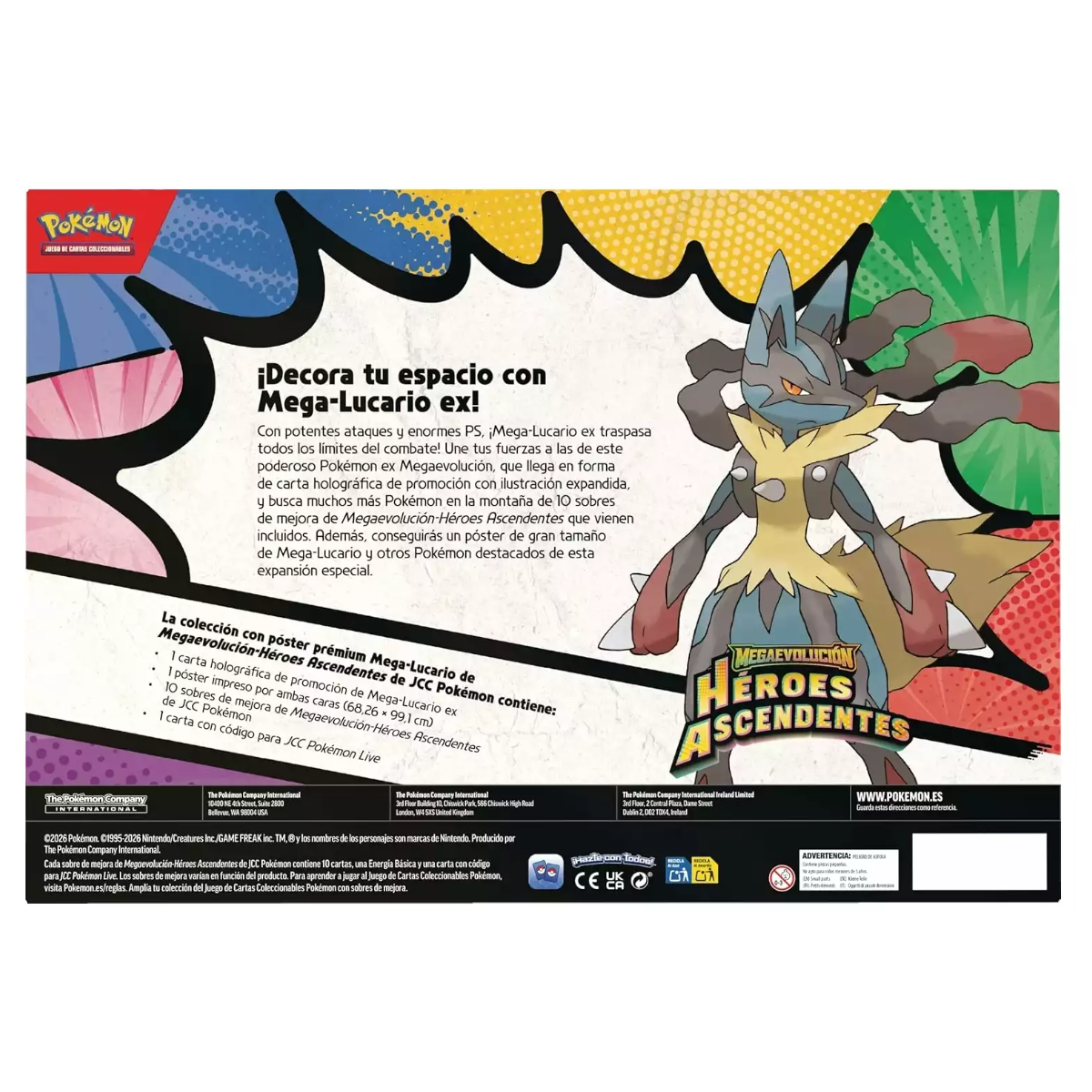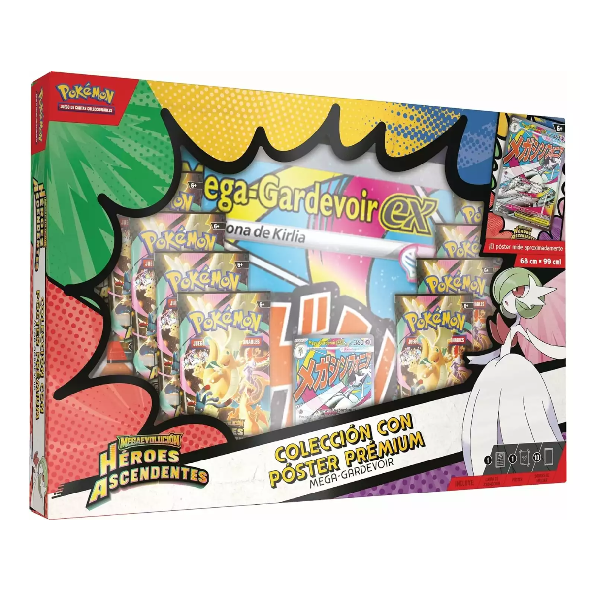 Colección premium Pokémon TCG Megaevolución Héroes Ascendentes con 10 sobres, carta promo holográfica Mega EX, póster doble cara y código para Pokémon Live. Ideal para fans y coleccionistas.