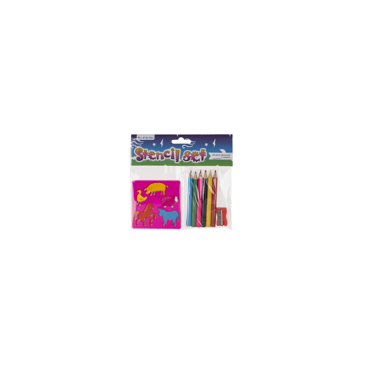 Un kit creativo que lo tiene todo para que niñas y niños den rienda suelta a su imaginación. Este set escolar incluye una plantilla de dibujo (stencil), seis lápices de colores surtidos y un sacapuntas, todo presentado en un práctico estuche con cierre. Está disponible en cuatro modelos diferentes, cada uno con diseños únicos: desde animales de granja hasta elementos del espacio o el clima, para inspirar dibujos y juegos temáticos.