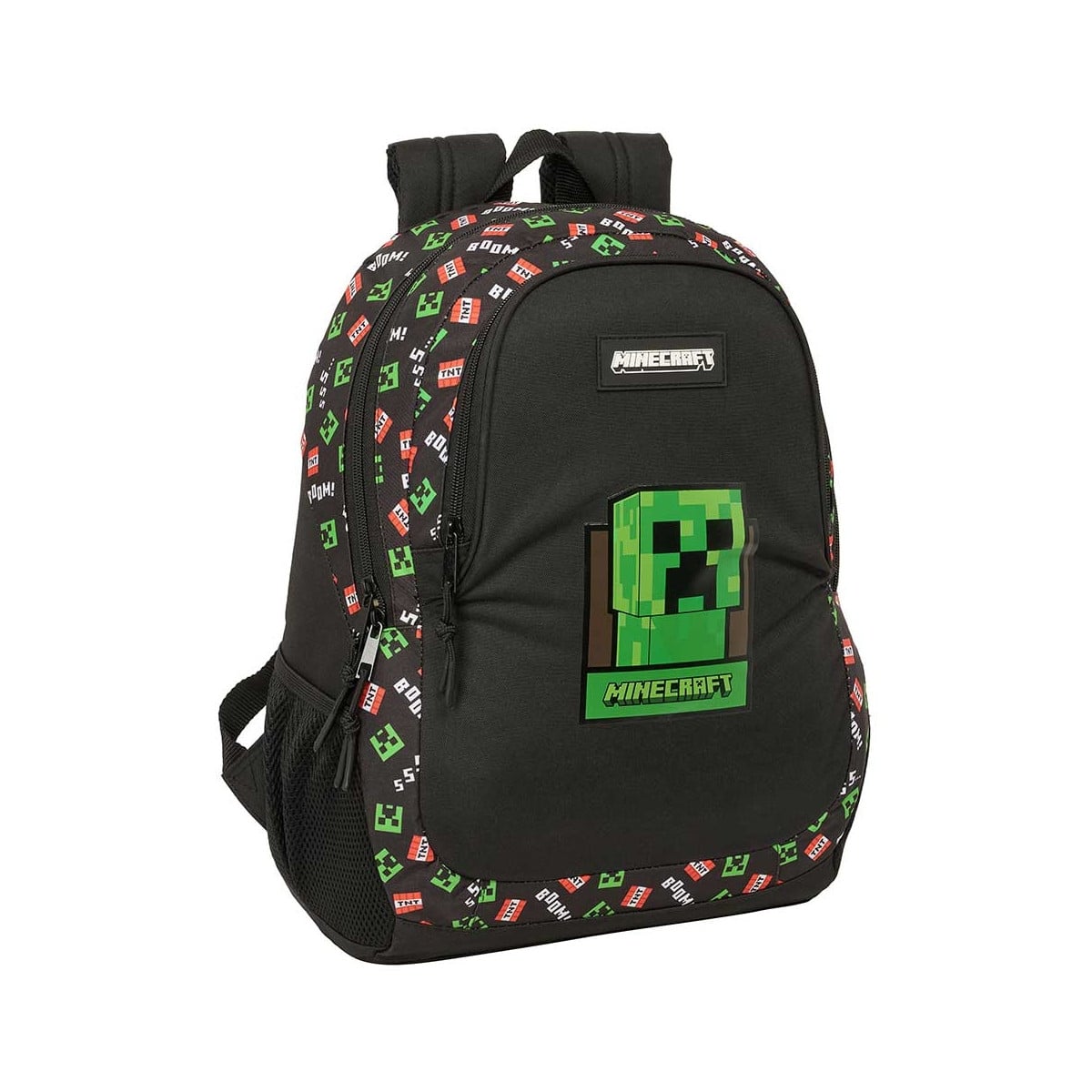 - Diseño: Mochila Minecraft con estampado de creepers y detalles pixelados característicos del videojuego, en tonos oscuros con toques verdes que encantan a niños y niñas.