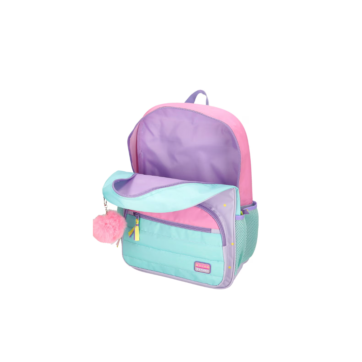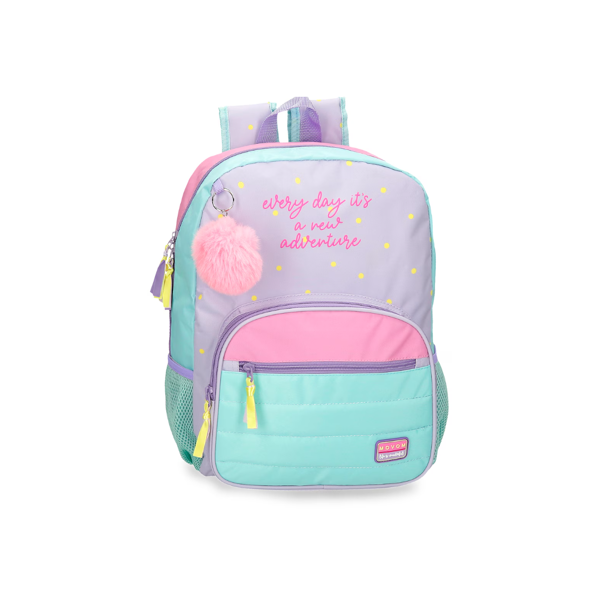 La Mochila Movom Adventure 42cm es una opción práctica, alegre y muy completa para niñas y niños que quieren llevar su material escolar con comodidad y estilo. Con un diseño en tonos pastel que combina el lila, el rosa y el turquesa, y el detalle de un simpático pompón rosa colgante, esta mochila transmite frescura y diversión desde el primer vistazo. El estampado de lunares amarillos sobre el fondo lila y el mensaje motivador “Every day it’s a new adventure” la convierten en un accesorio lleno de energía positiva.