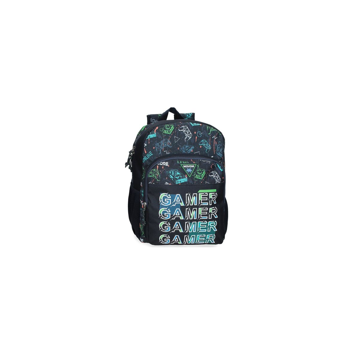 La Mochila Movom Game Over 40 cm es la opción perfecta para niñas y niños que adoran el mundo gamer y quieren llevar ese estilo a sus días de colegio o actividades. Su diseño moderno en color negro con ilustraciones de consolas, mandos y mensajes relacionados con los videojuegos destaca por su originalidad, mientras que el frontal con la palabra “GAMER” repetida en tipografía llamativa añade un toque único y atrevido.