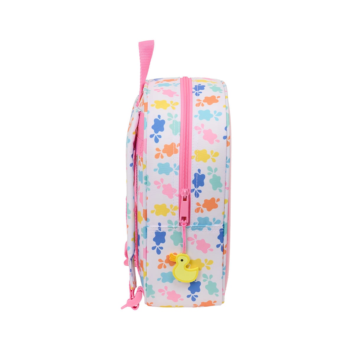 Su formato compacto está pensado para llevar lo esencial de forma cómoda, con un compartimento principal con cremallera donde guardar almuerzo, juguetes o pequeños accesorios. Gracias a su estructura ligera, resulta fácil de manejar tanto para los peques como para los adultos.