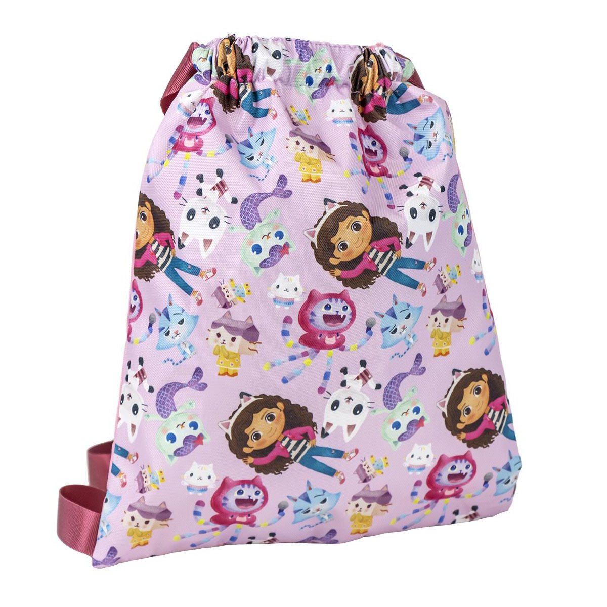 Saquito estampado de La Casa de Muñecas de Gabby, ideal para llevar juguetes y libros. Duradero, con cierre seguro y correas ajustables. Perfecto para fans.