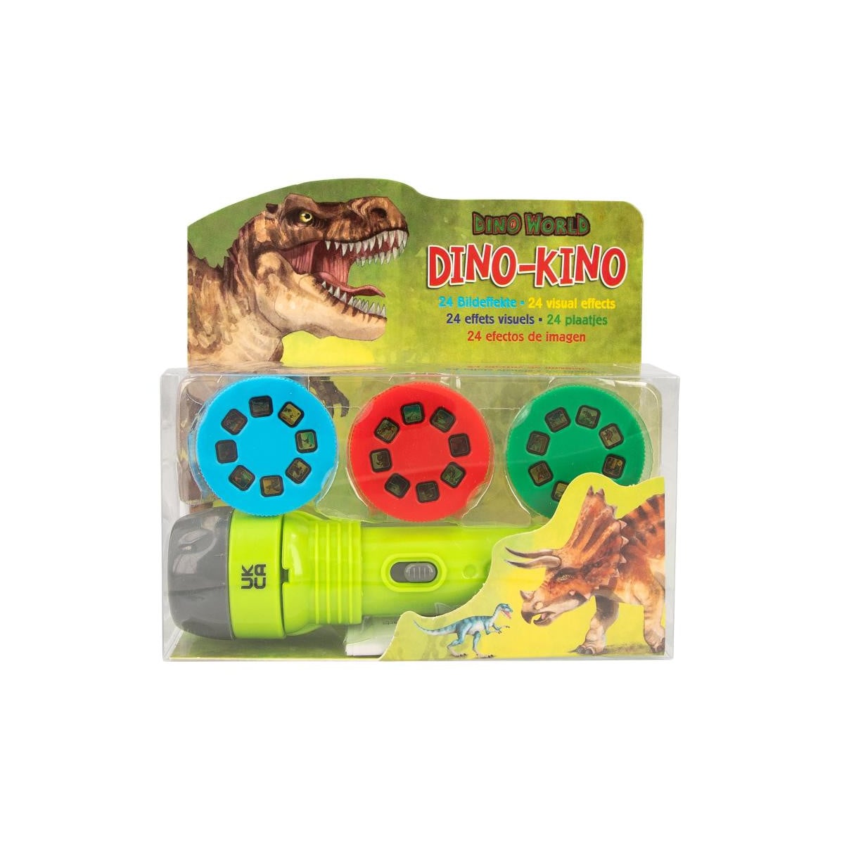 Una linterna que funciona como un proyector. Gracias a los 3 discos, pueden verse hasta 24 imágenes diferentes de dinosaurios.