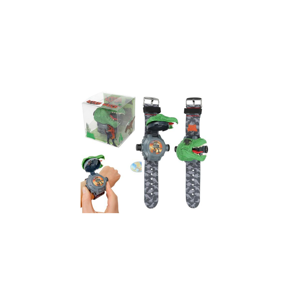 Reloj de pulsera Dino World con proyector de 24 dinosaurios, correa textil gris y tapa T-Rex abatible. Diversión jurásica para que aprendan la hora.