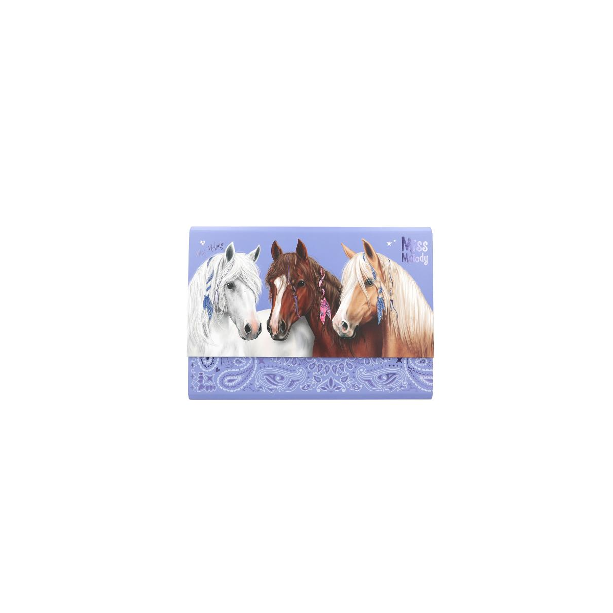 El Miss Melody Archivador con Papel de Cartas es un precioso set de papelería pensado para niñ@s que disfrutan escribiendo, dibujando y guardando sus cartas de forma ordenada. Inspirado en el elegante universo Miss Melody, este archivador destaca por su diseño con caballos y detalles estilo bandana, que le aportan un aire dulce y actual.