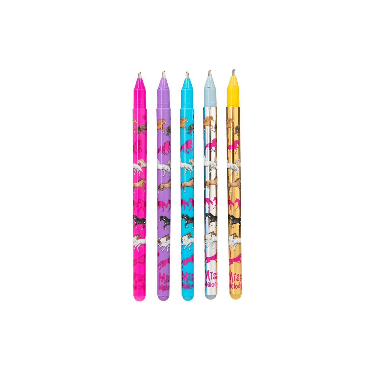 - Incluye: 1 set de rotuladores Miss Melody de gel de colores con purpurina (rosa, lila, azul, gris y amarillo) con estampado de caballos y punta fina en estuche transparente