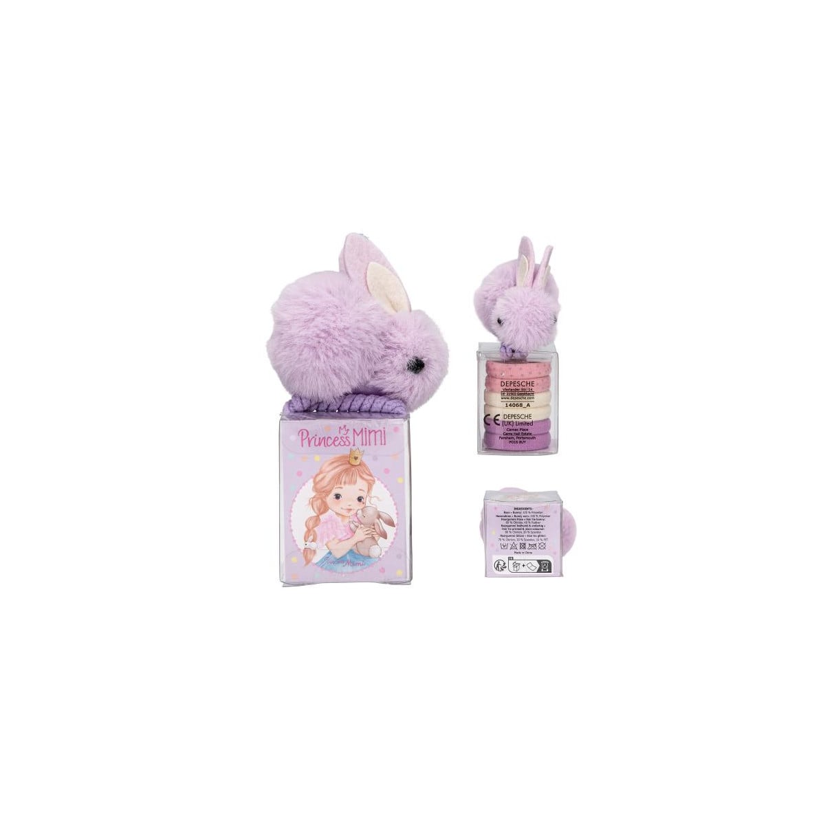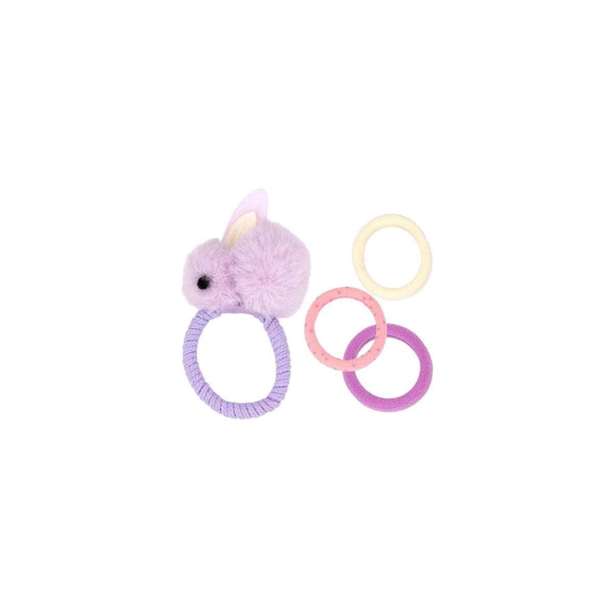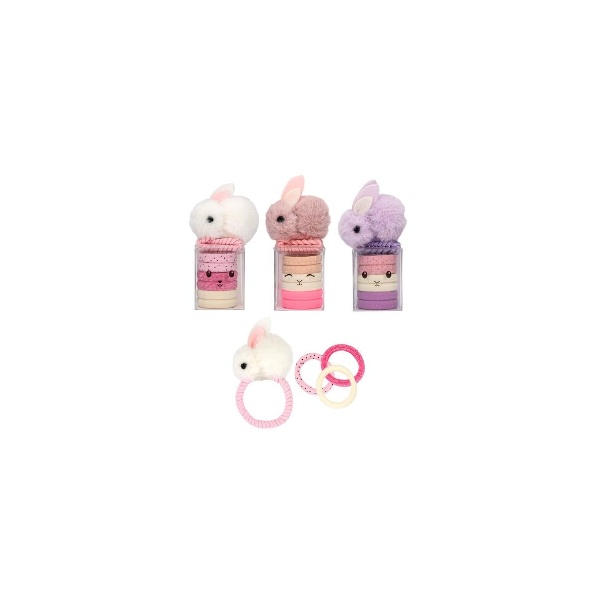 Set de gomas Princess Mimi surtido con conejito y purpurina. Incluye 7 piezas variadas, ideal para peinados dulces y divertidos.