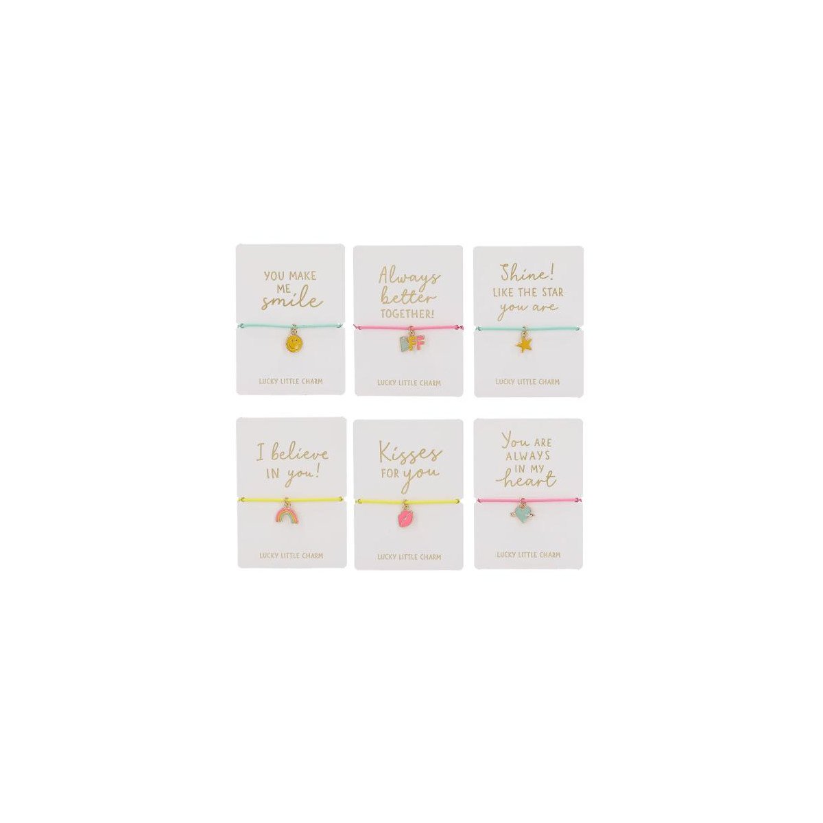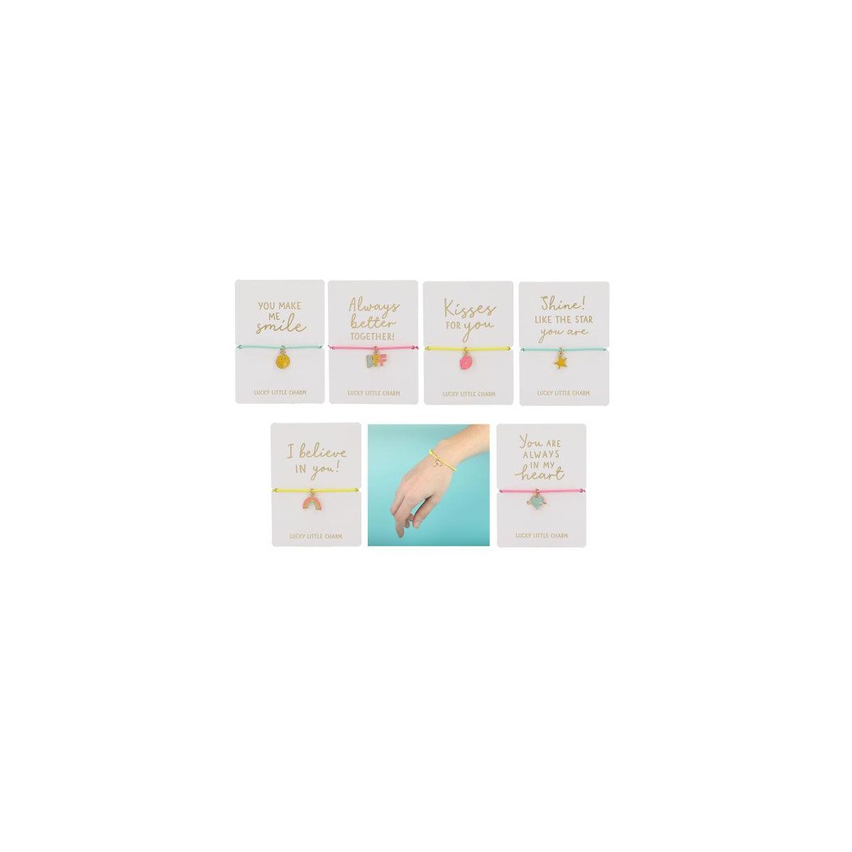 Pulseras elásticas coloridas con colgantes y tarjeta personalizada; se venden surtidas y alegran las muñecas de niñas y niños.