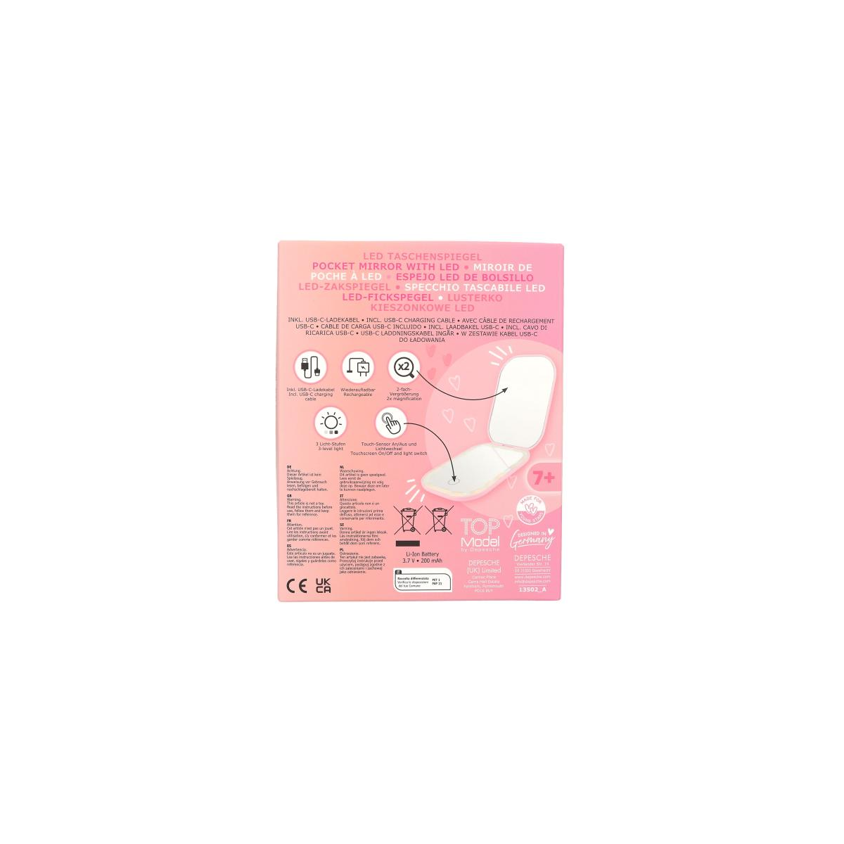 El espejo está fabricado con un diseño elegante y un marco en tono suave que combina con el estilo característico de la colección TOP Model Beauty & Me. Incluye además un cable USB-C para recargar su batería integrada, lo que lo hace reutilizable y respetuoso con el medioambiente.