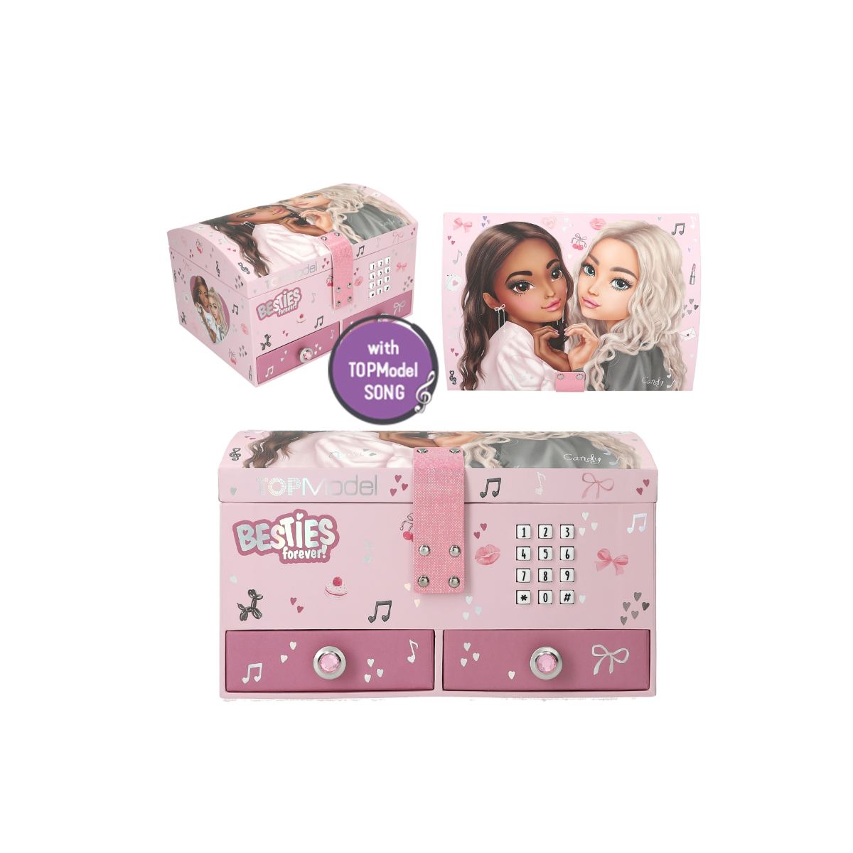 - Diseño atractivo: Joyero que solo puede abrirse al introducir correctamente el código de 4 dígitos (se puede personalizar). Cuando se abre suena la canción TOPModel Best Friends (durante 20 segundo aprox).