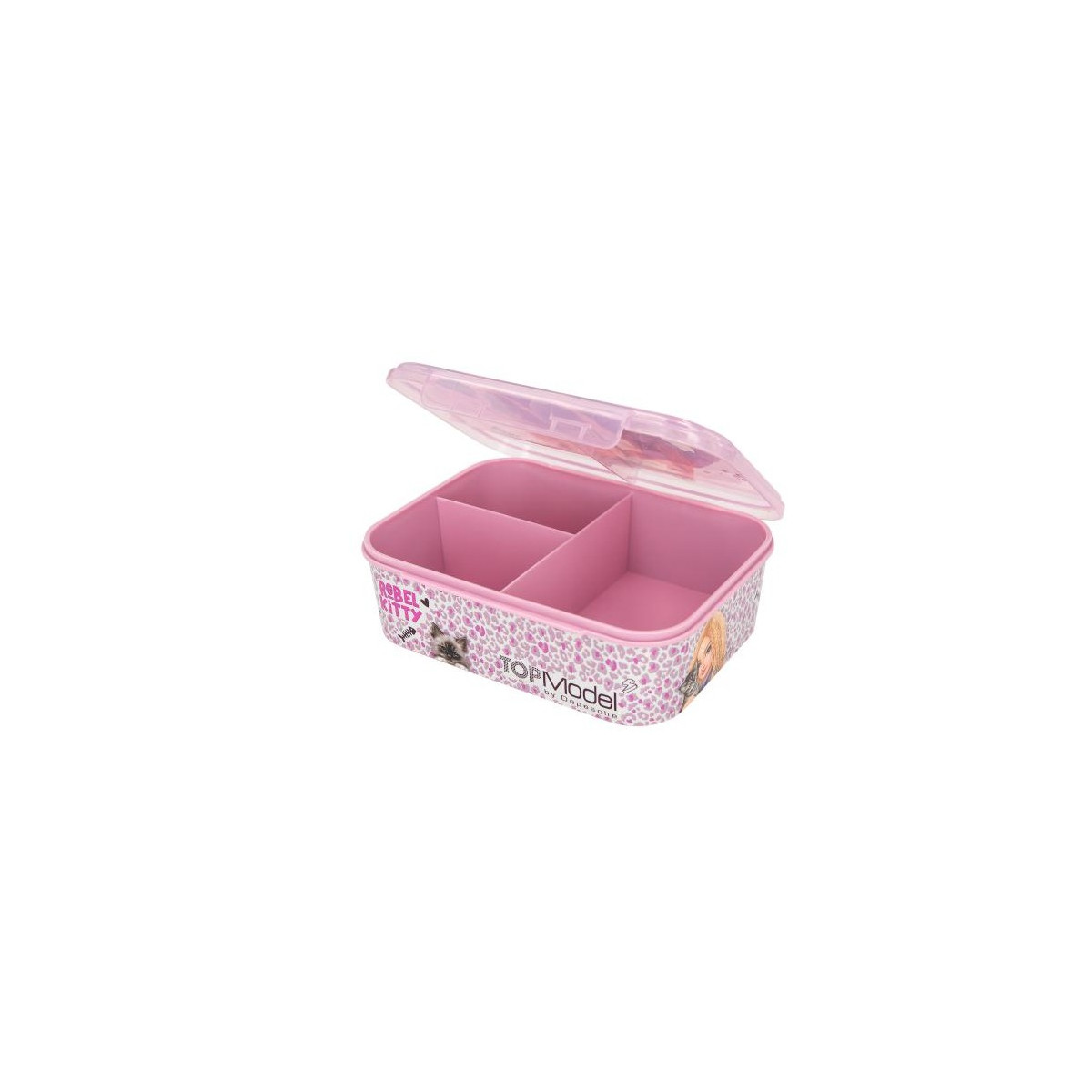 ¡La hora del almuerzo ahora tiene mucho más estilo! El táper TOP Model Rebel Kitty es la combinación perfecta entre funcionalidad y diseño para niñas y niños que adoran la moda y la organización. Con una tapa ilustrada con tres de las modelos más icónicas de TOP Model —Christy, Fergie y Lexy—, este táper destaca por su diseño moderno, colores vibrantes y un aire rebelde y divertido.