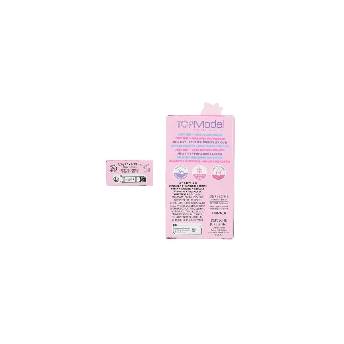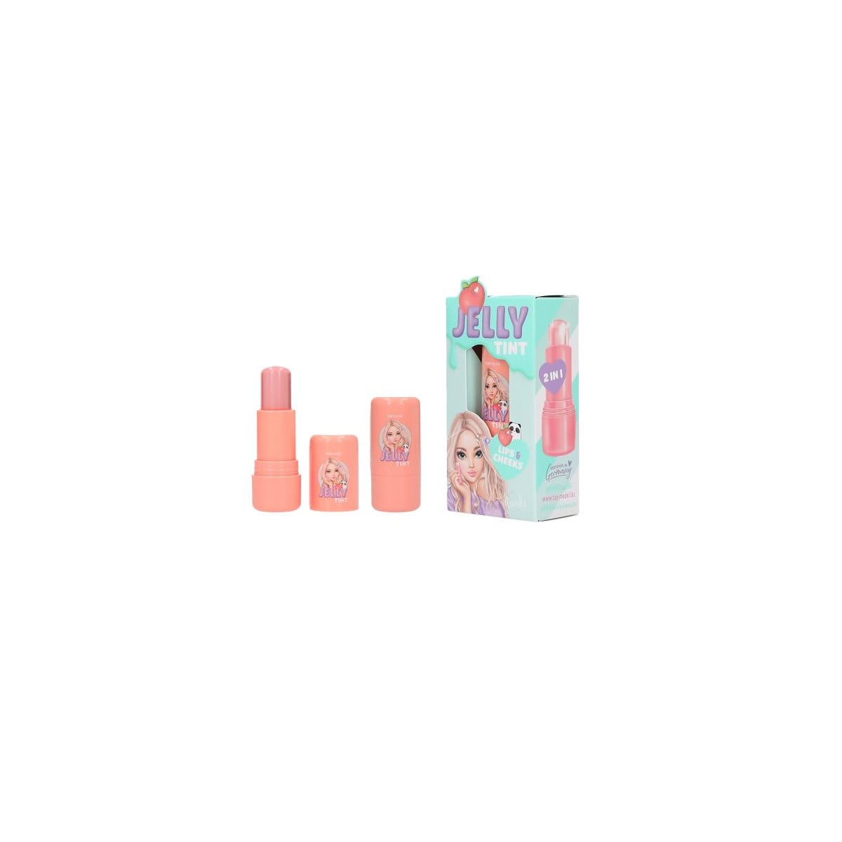 Gelatina TOPModel para labios y mejillas en formato lápiz. Dos colores con aroma a fruta, fácil de aplicar y perfecta para looks suaves y divertidos.