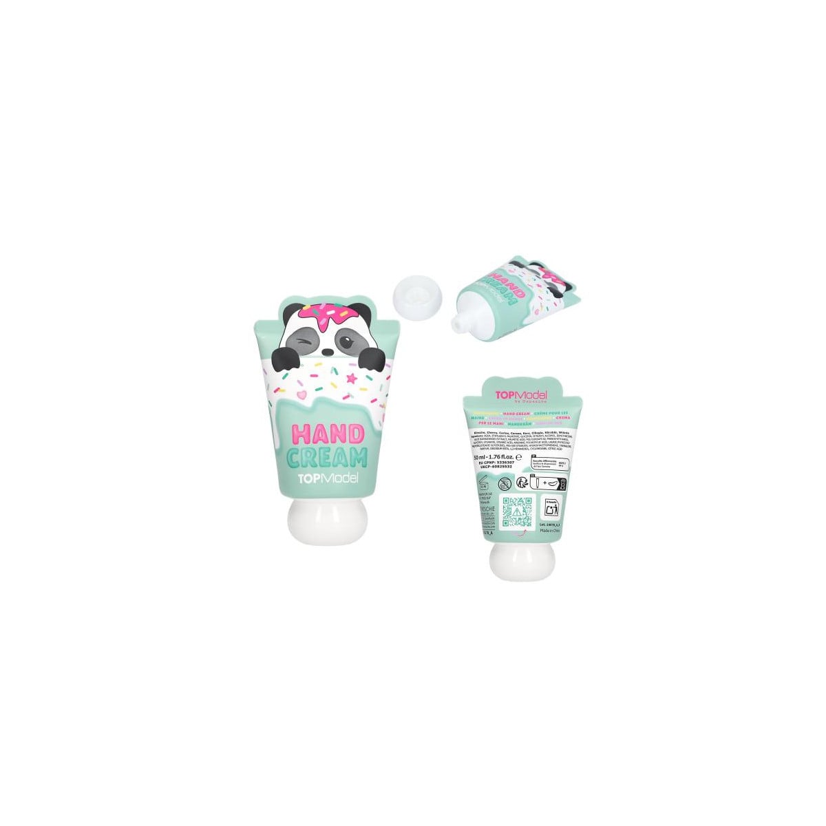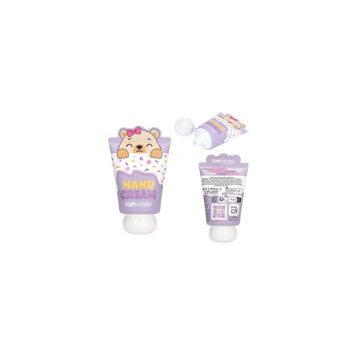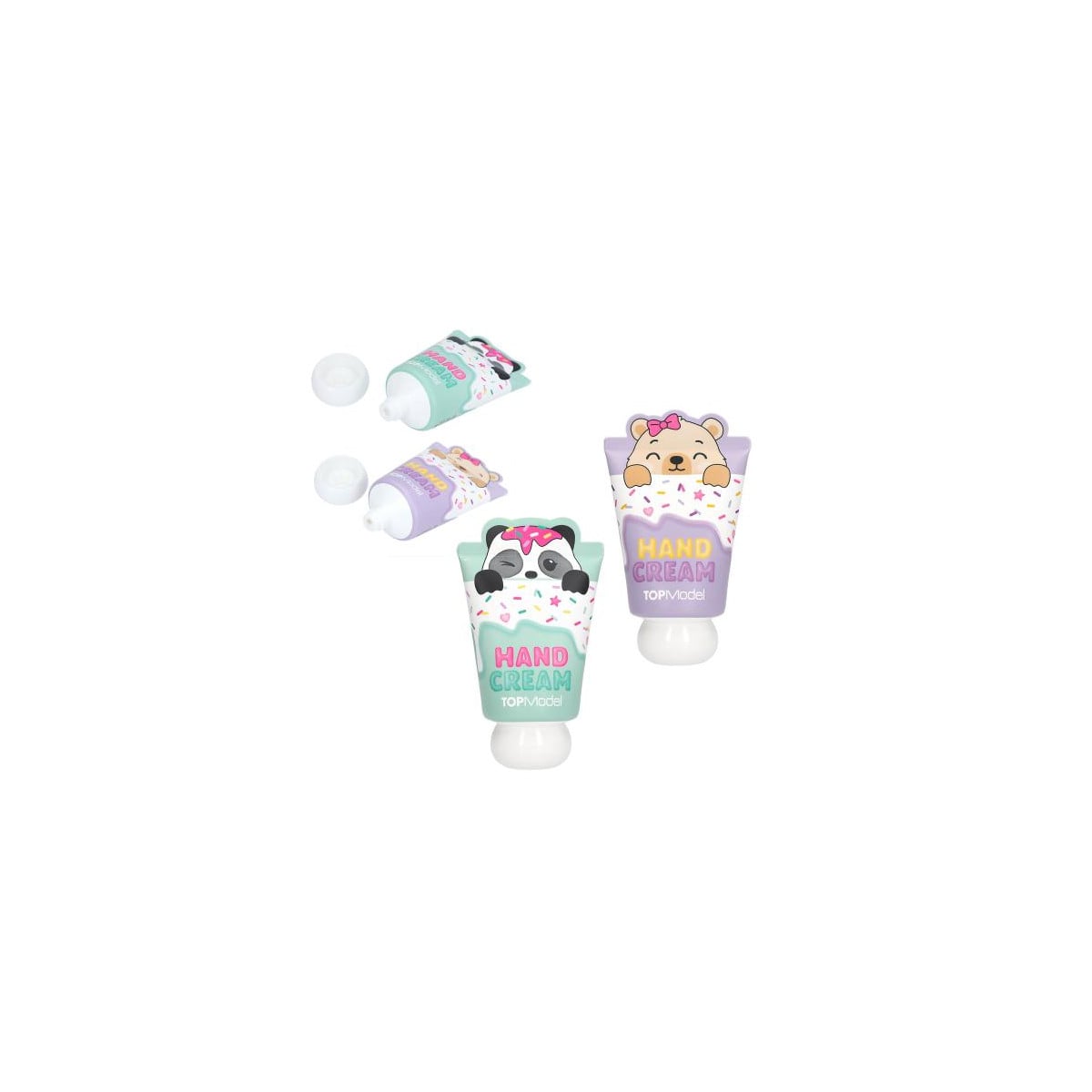 Crema de manos TOPModel Candy Glam de 50 ml con diseños de osito y panda. Hidrata y deja un agradable aroma a vainilla o cereza. Ideal para uso diario.
