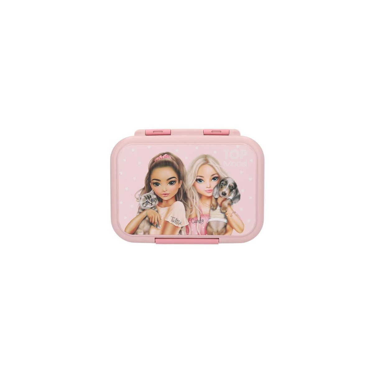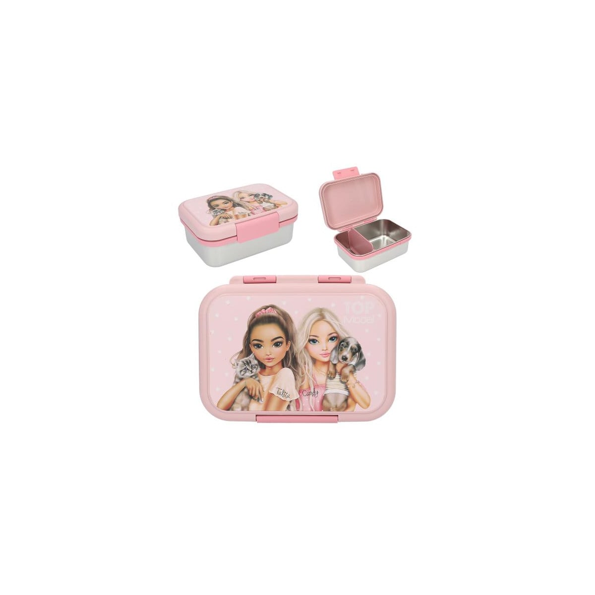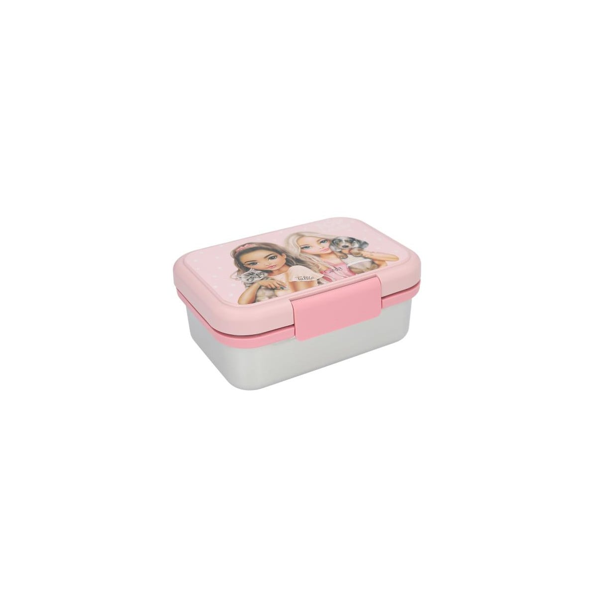 La fiambrera de acero inoxidable TOPModel es una opción práctica, resistente y con un diseño encantador para el día a día. Su tapa de plástico en color rosa está decorada con una bonita ilustración de dos modelos junto a un perrito y un gatito, lo que la convierte en un accesorio ideal para llevar el almuerzo al cole o de excursión.
